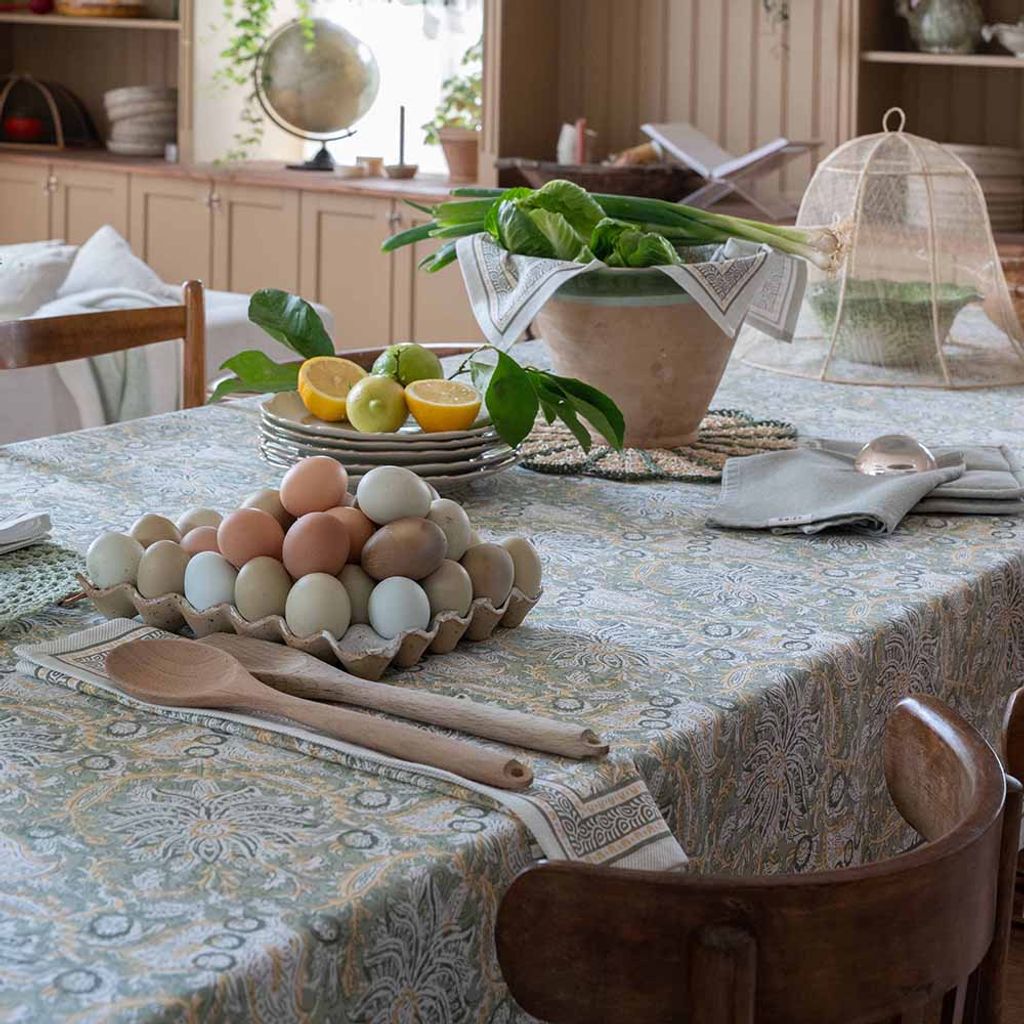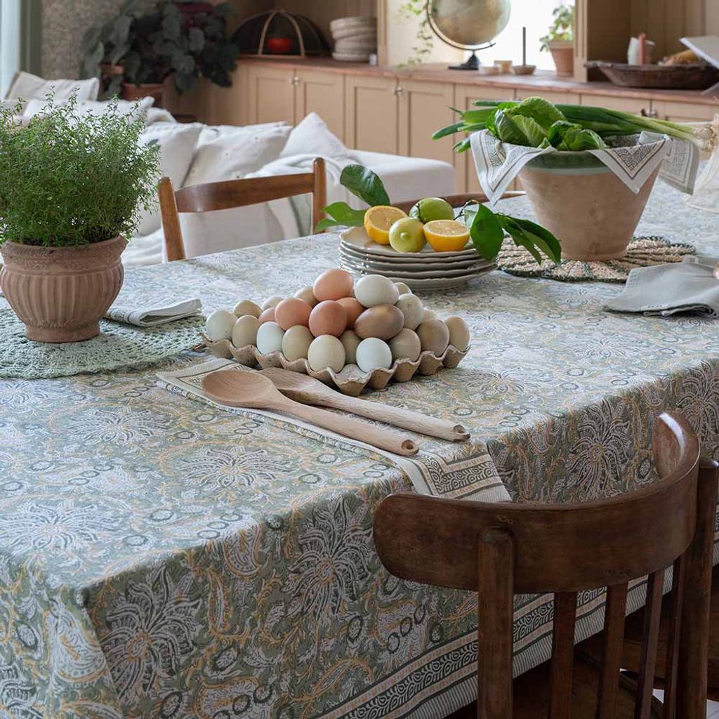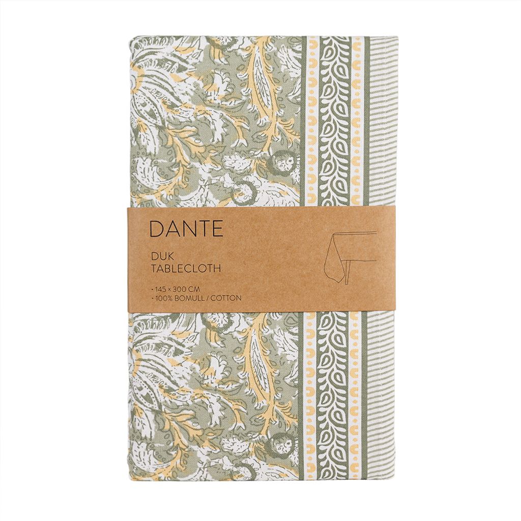 Dante grön bordsduk är en dekorativ duk i 100 % bomull med ett livfullt mönster och eleganta bårder. En harmonisk duk som ger dukningen ett naturligt och inbjudande uttryck.