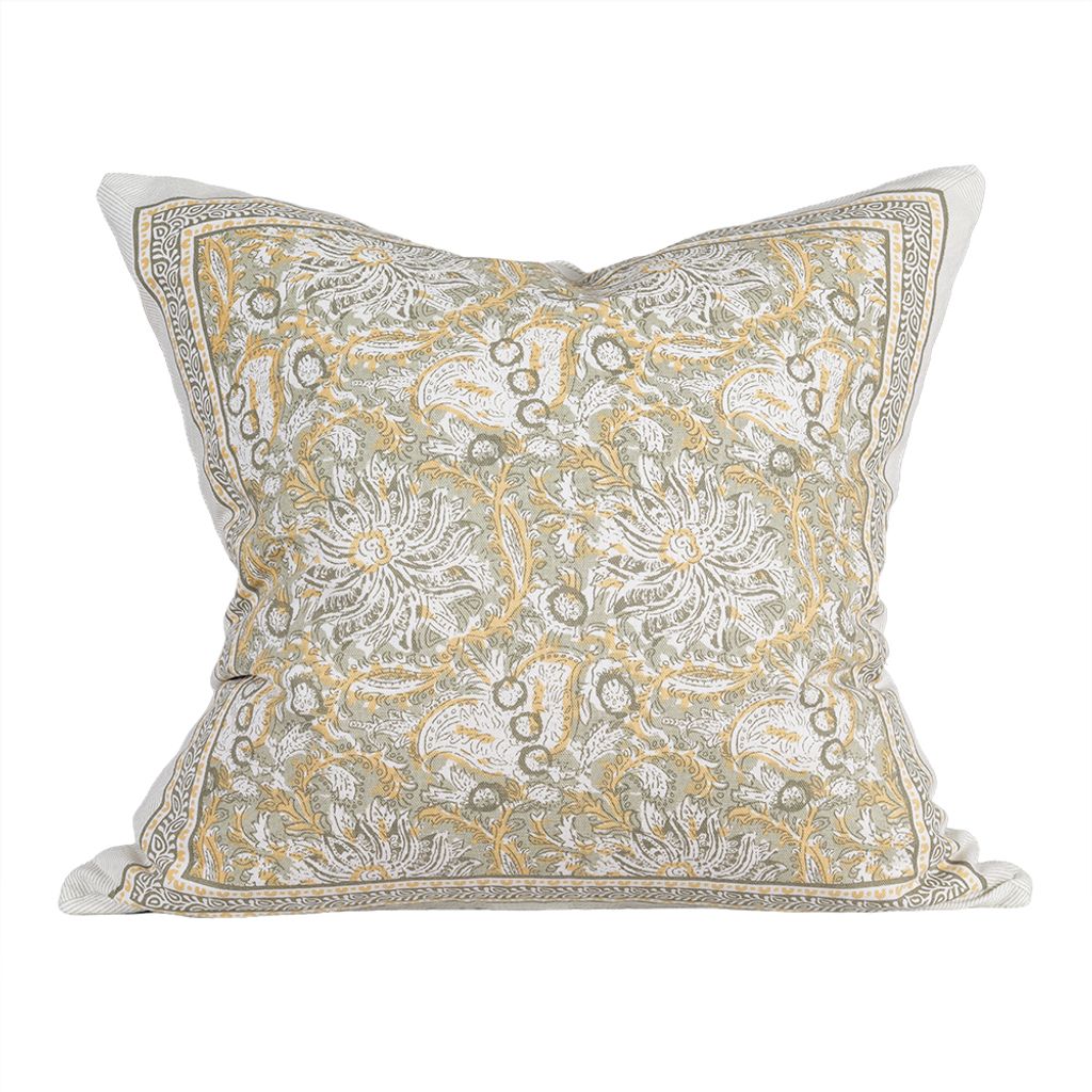 Dante är ett uttrycksfullt kuddfodral i en mjuk grön färgskala med inslag av varma gula och ljusa toner. Det detaljrika mönstret skapar ett levande men balanserat uttryck som ger inredningen karaktär utan att ta över.