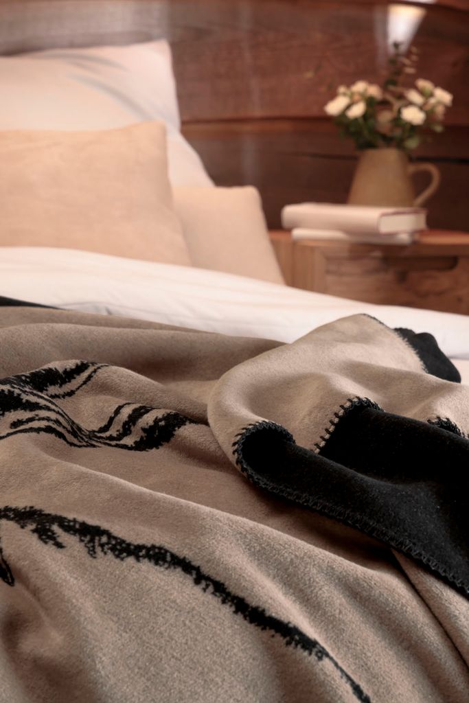 En mjuk och stilren filt i beige med ett klassiskt hjortmotiv. Tillverkad i Tyskland av en hållbar mix av bomull och polyester, varav en stor andel återvunnet material. Perfekt för sängen, soffan eller som en dekorativ detalj i hemmet.