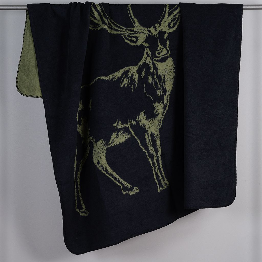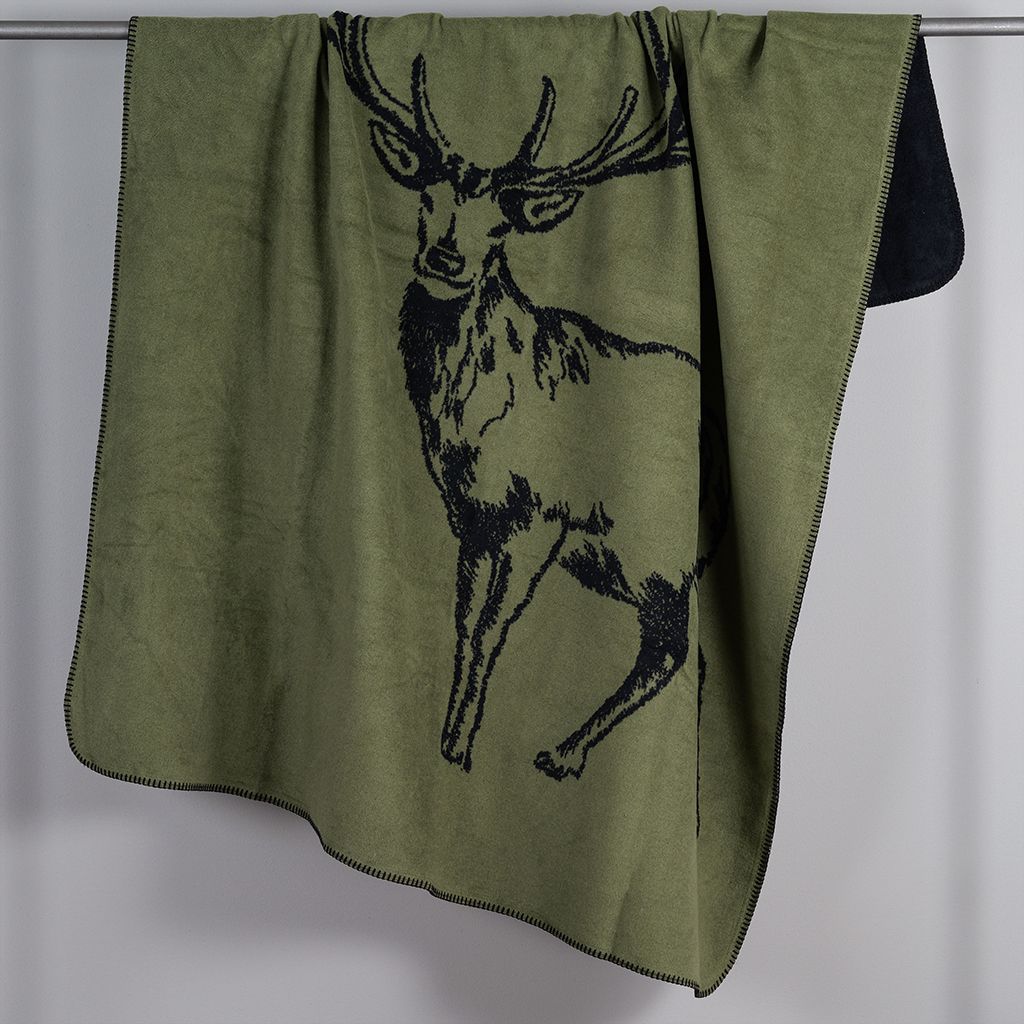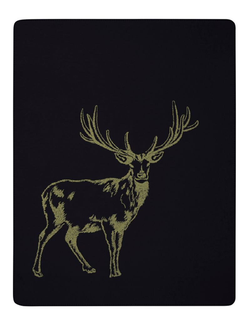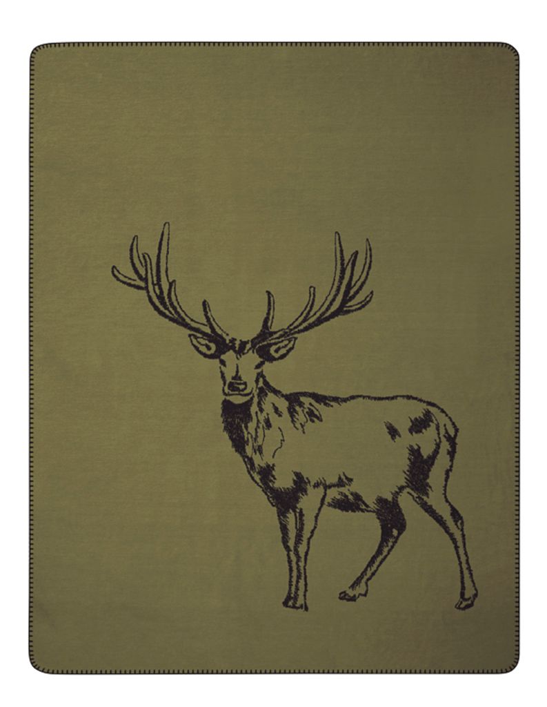 En mjuk och stilren filt i grönt med ett klassiskt hjortmotiv. Tillverkad i Tyskland av en hållbar mix av bomull och polyester, varav en stor andel återvunnet material. Perfekt för sängen, soffan eller som en dekorativ detalj i hemmet.