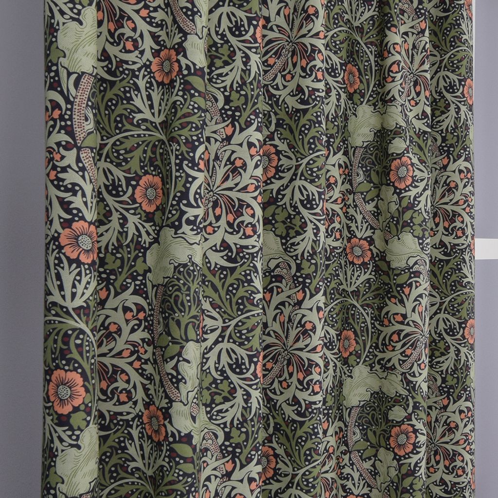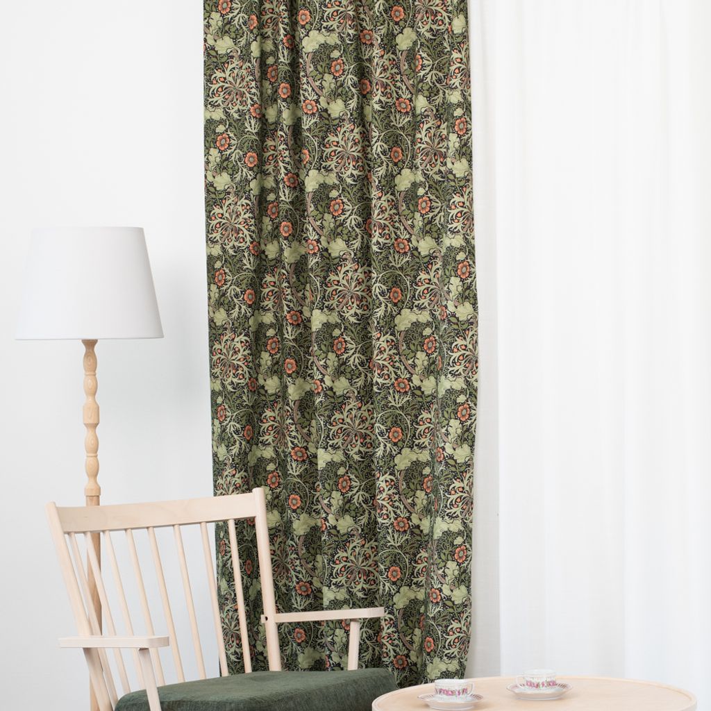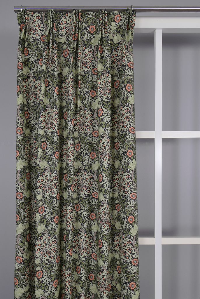 Gardiner med svart botten och ett snirkligt och blommigt mönster i grönt och aprikos orange.