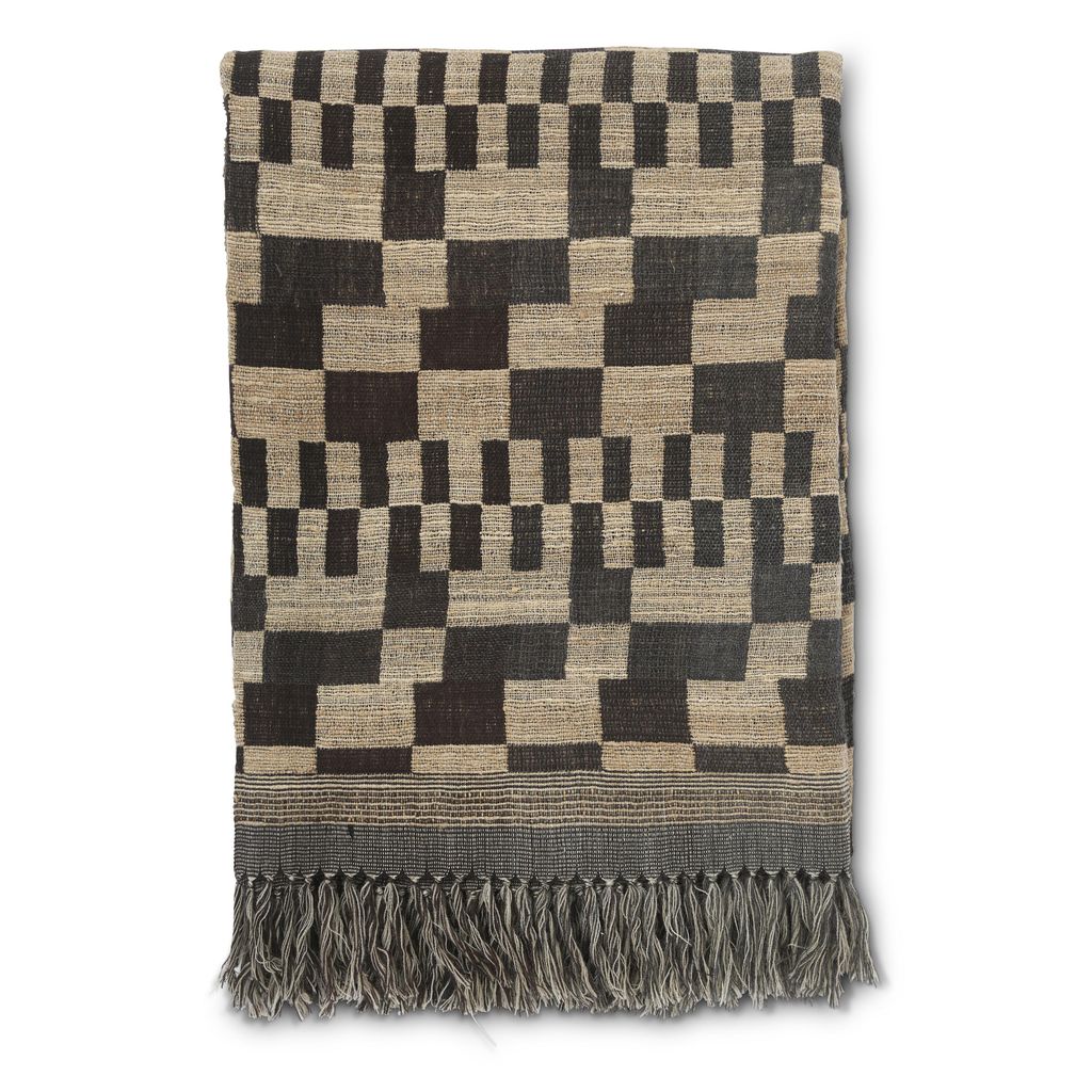 Det grafiska mönstret består av rutor i olika storlekar, vilket skapar ett levande och spännande formspråk. De jordnära tonerna i svart och beige ger pläden ett varmt och balanserat uttryck som passar i både moderna och klassiska miljöer.