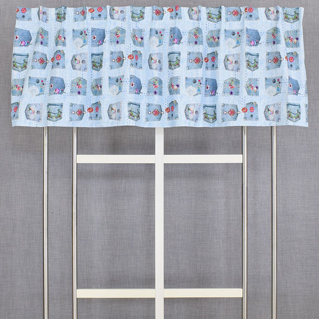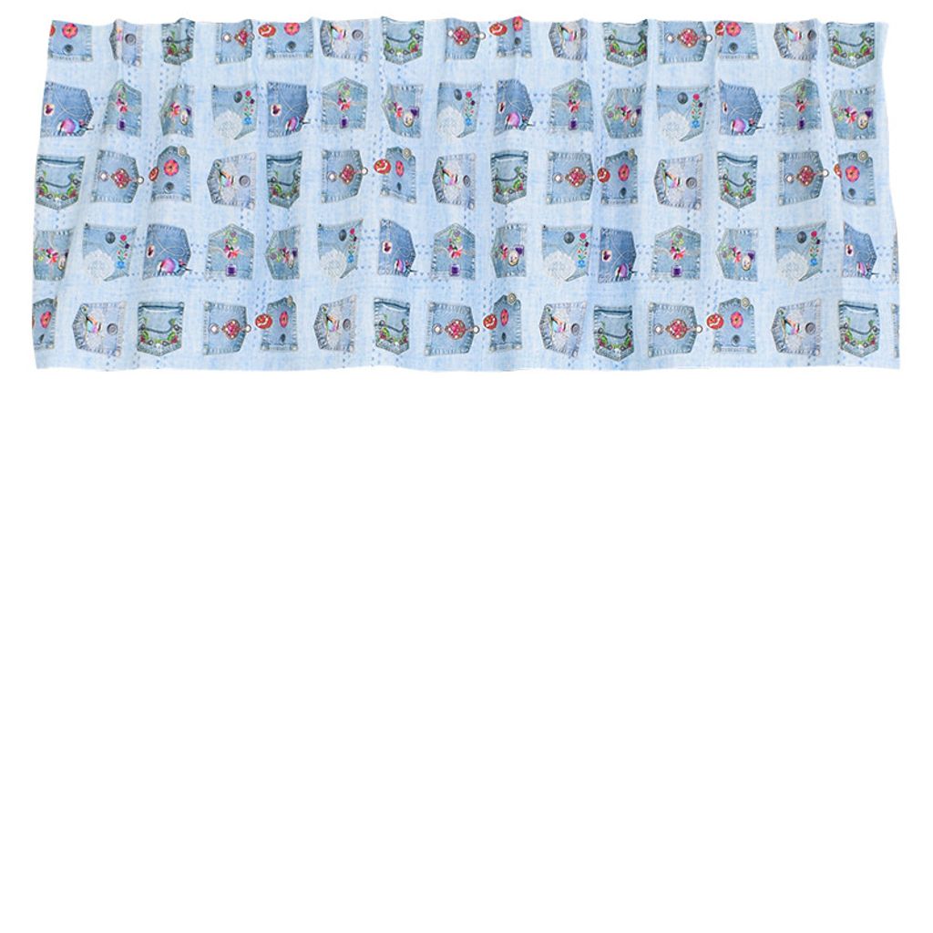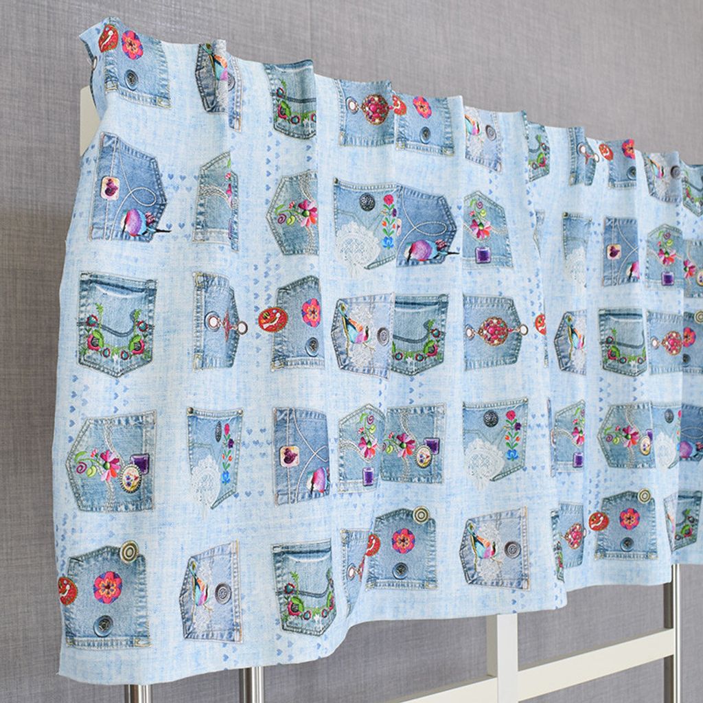Gardinkappa på metervara Denim med jeans mönster och fickor från Arvidssons Textil.