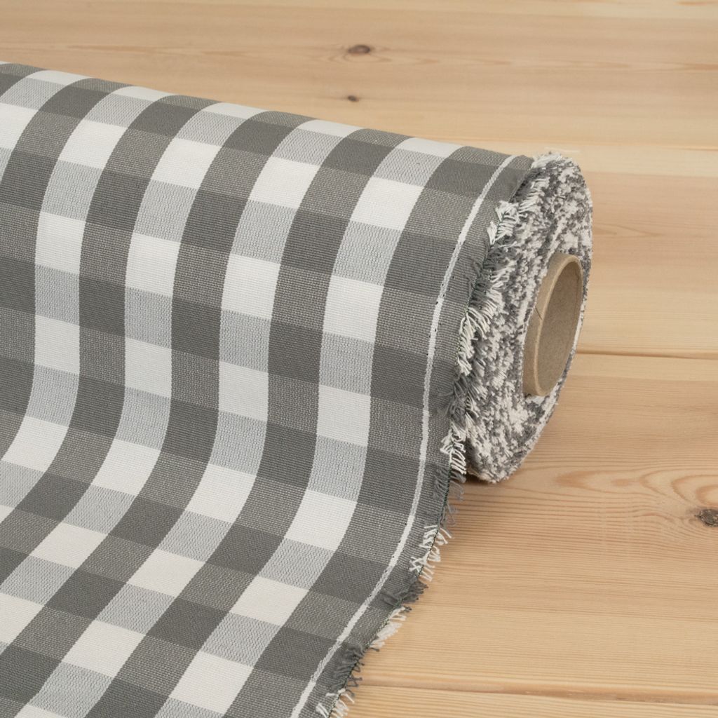 Rutigt tyg i offwhite och ljusgrått som passar både till gardin och möbler.