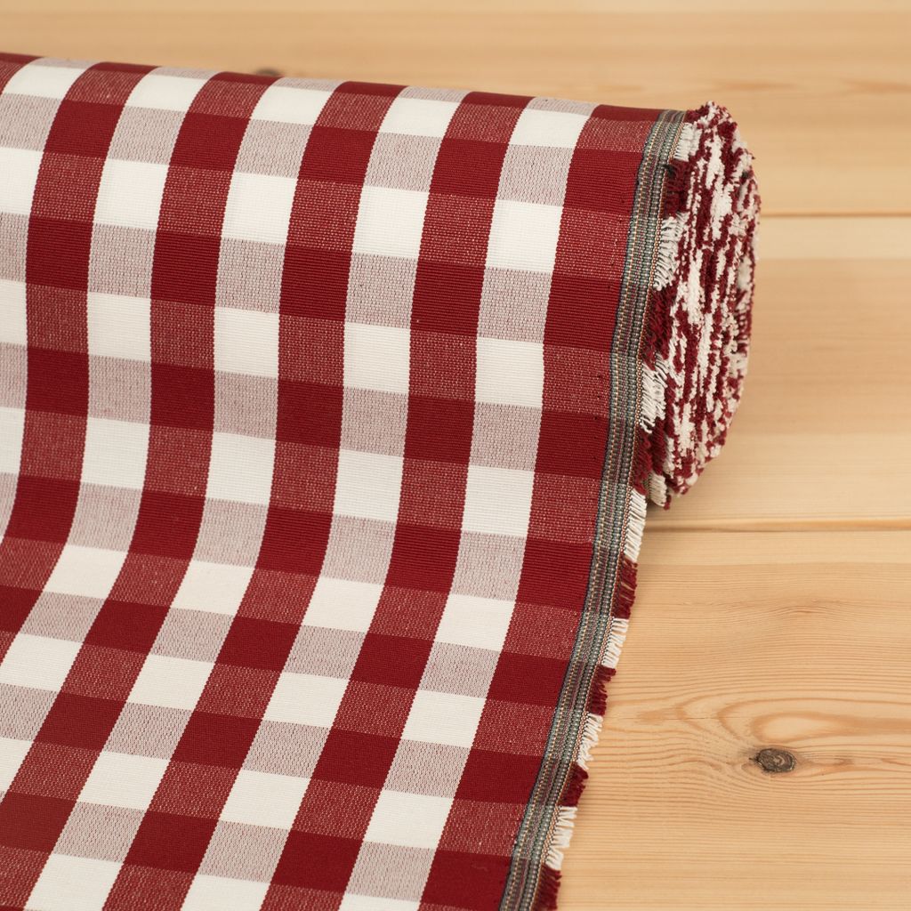 Rutigt tyg i offwhite och rött som passar både till gardin och möbler.