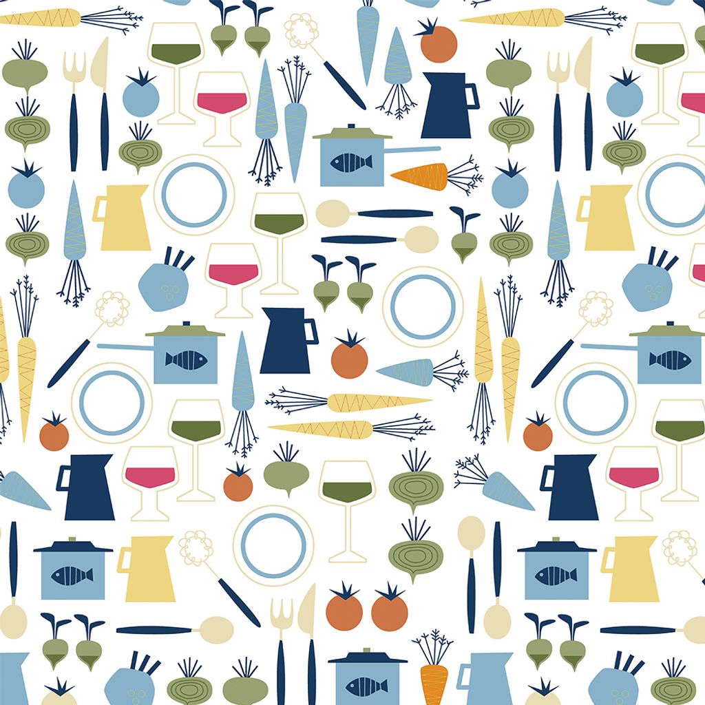Dinner blå är ett mönster som för tankarna till matglädje, vardagsliv och gemenskap runt bordet. Motivet består av grafiskt förenklade illustrationer av tallrikar, bestick, glas, kastruller, fisk och grönsaker, arrangerade i ett tätt och livfullt mönster som ger tyget ett tydligt uttryck utan att kännas rörigt.