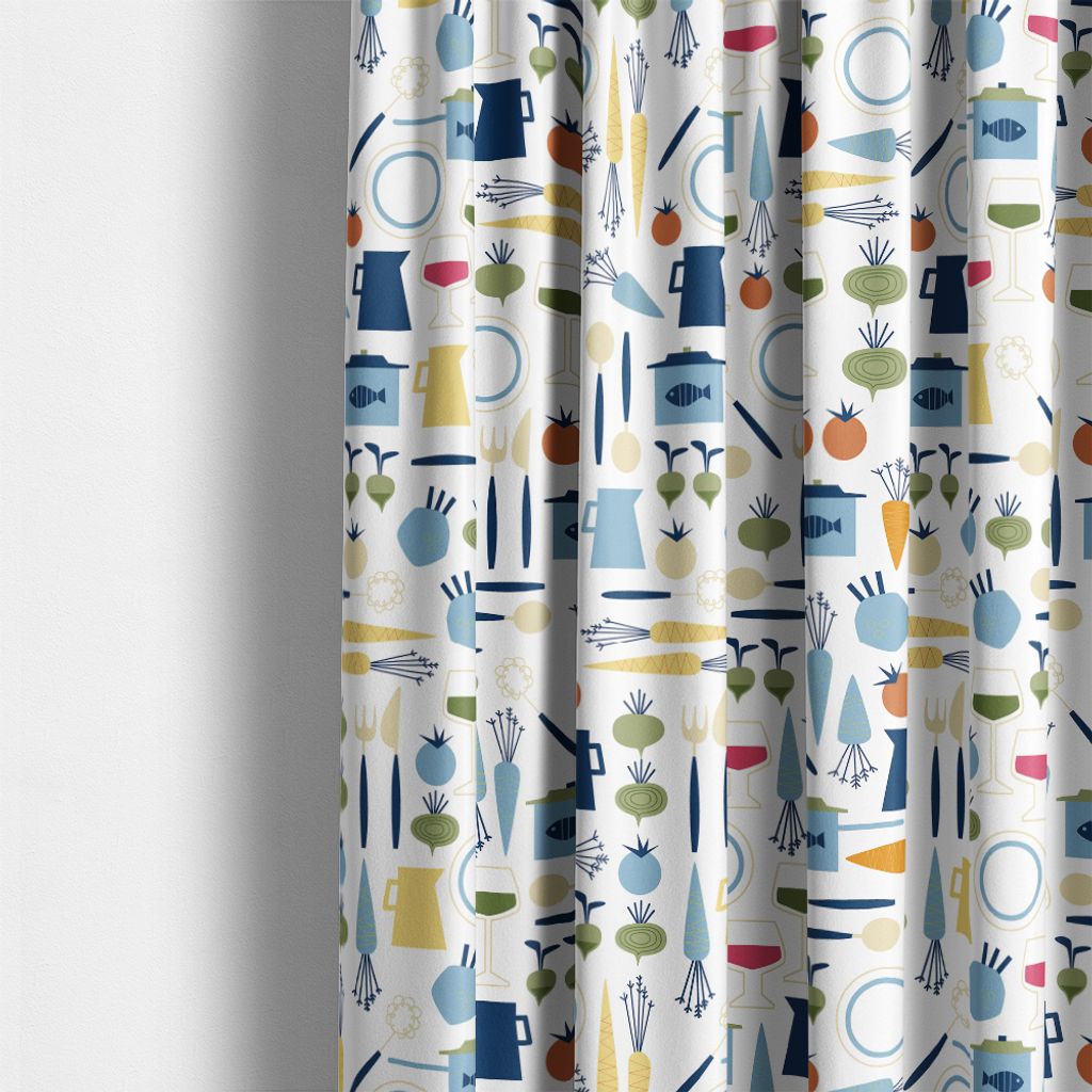 Dinner blå är ett lekfullt mönstrat tyg med stiliserade motiv av köksredskap, grönsaker och dukning i en harmonisk färgskala av blått, grönt, gult och rost. Ett dekorativt tyg som passar lika bra till gardiner som till dukar, kuddar eller kreativa sömnadsprojekt i kök och matrum.