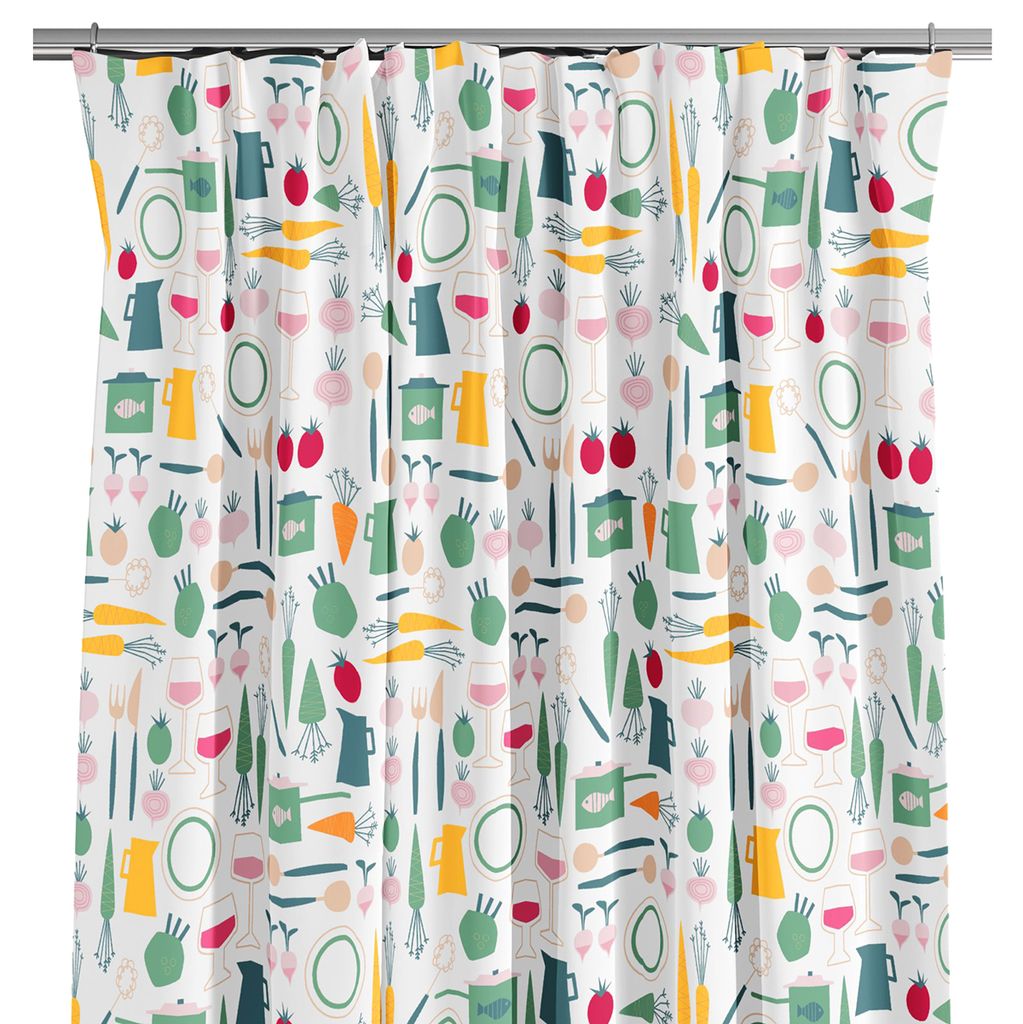 Dinner grön gardiner har ett lekfullt retroinspirerat köksmotiv i gröna, gula, rosa och röda toner. Mönstret med porslin, bestick och grönsaker skapar en varm och inbjudande känsla som passar perfekt i kök eller matplats.