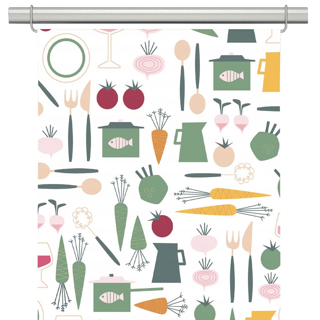 Dinner grön panelgardiner har ett lekfullt köksinspirerat retromönster i gröna, rosa och varma toner. Ett dekorativt val som ger köket eller matplatsen ett personligt och inbjudande uttryck.