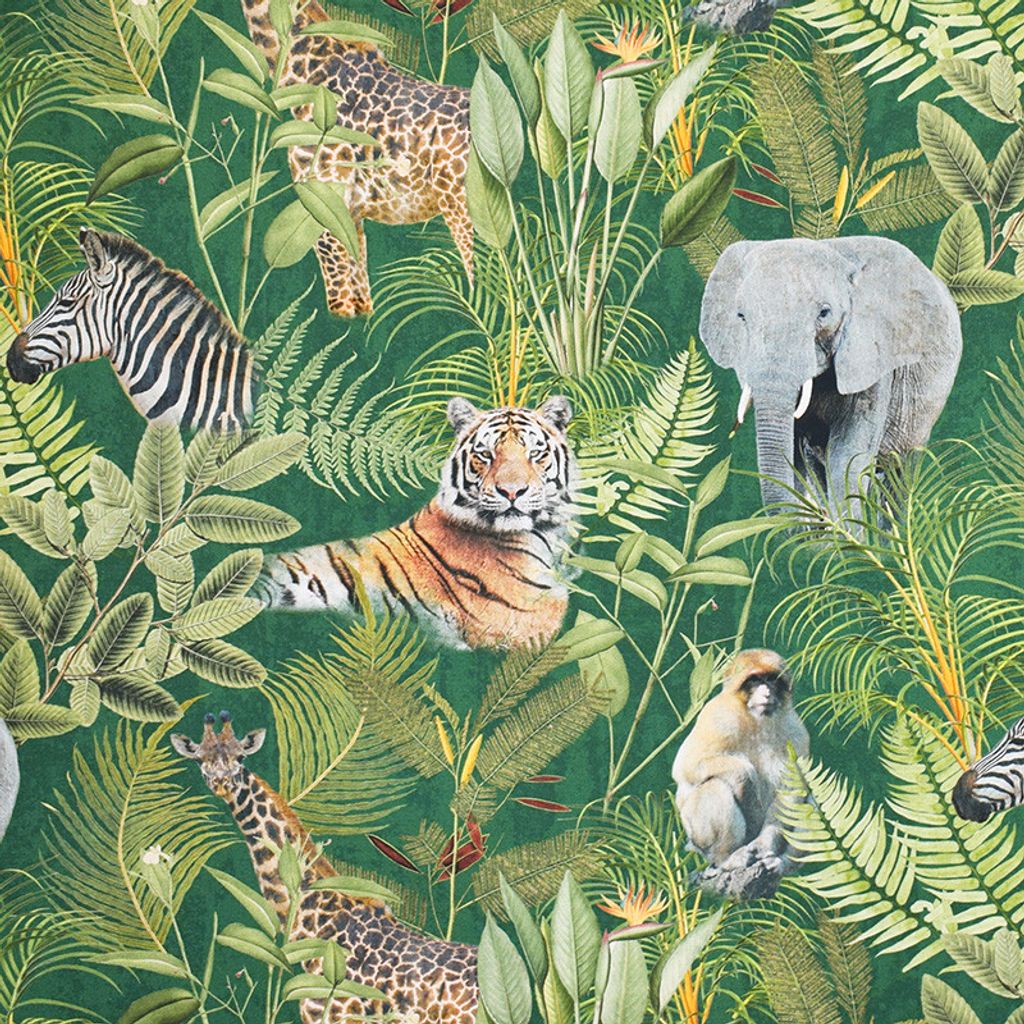 Tyg på metervara för gardiner och inredning med motiv av djungeldjur på grön botten.