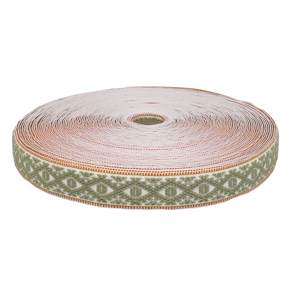 Vävt band med oblekt botten och grön och gult mönster