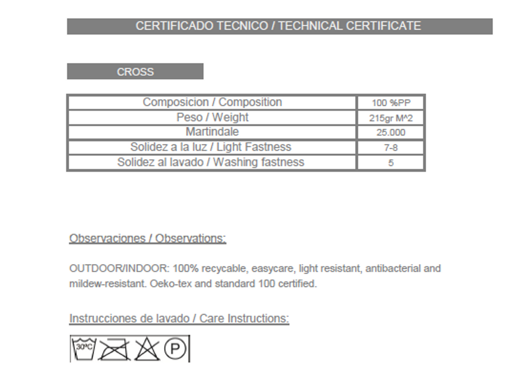 Outdoor/indoor: 100% recycable, easycare, light resistant, antibacterial and mildew-resistant. Oeko-tex and standard 100 certified.