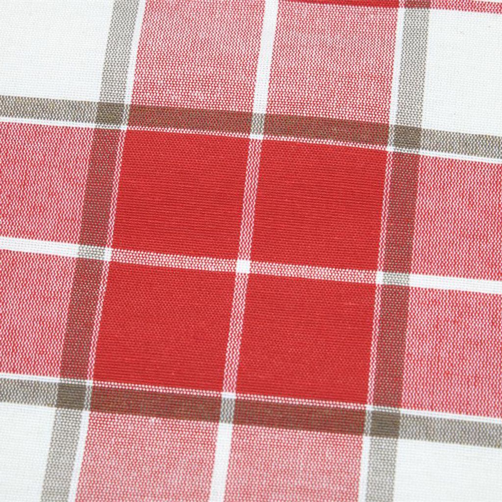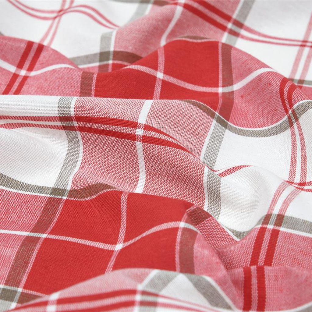 Rutigt rött, beige och offwhite tyg som lämpar sig bra till dukar och gardiner.