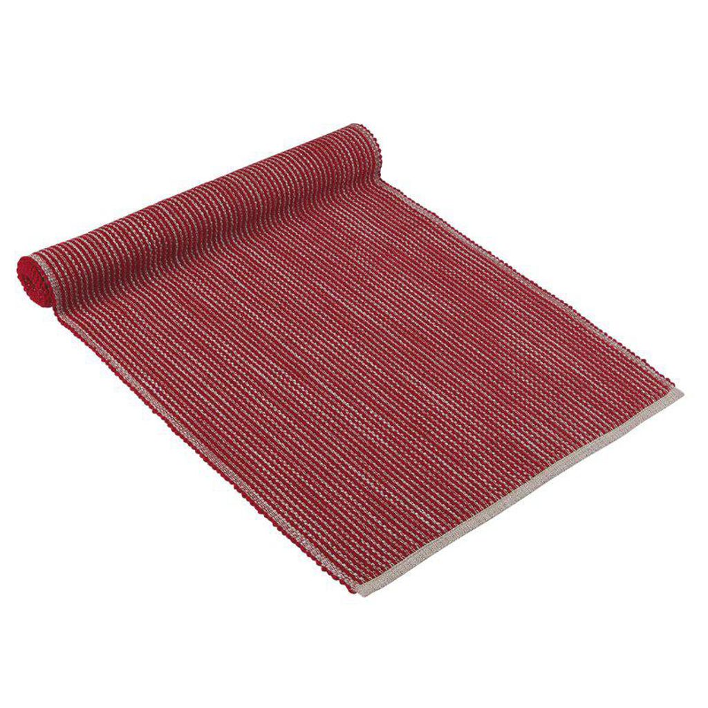 Röd och offwhite löpare som är tillverkad i bomull och polyester.