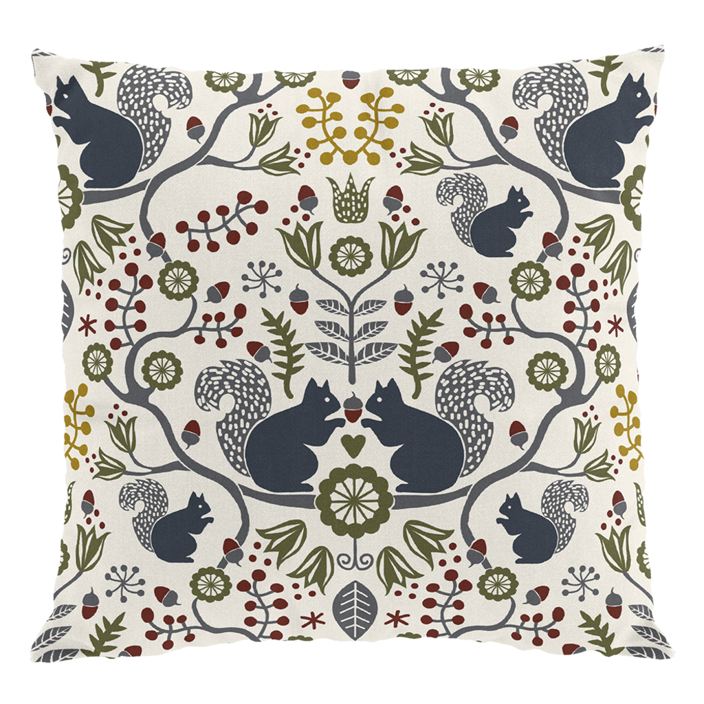 Ett Kuddfodral med mönster av växtmotiv med två ekorrar. Mönstret är tryckt på Arvidssons klassiska bomullsvara. Produkten är stolt tillverkad i Estland.