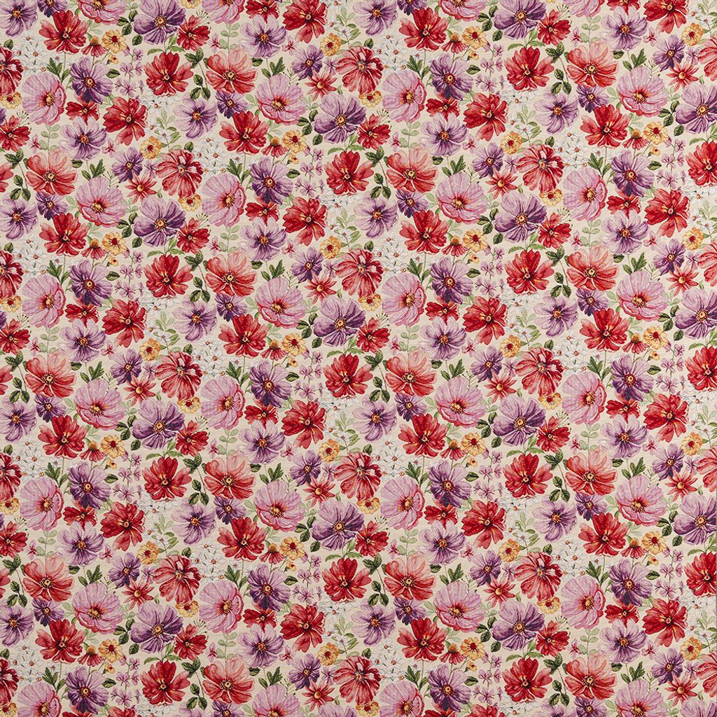 Elizabeth gobeläng är ett vackert och uttrycksfullt möbeltyg med ett detaljerat blomsterhav i nyanser av rött, rosa, lila och grönt. Mönstret känns både klassiskt och levande – perfekt för dig som vill skapa en ombonad och elegant atmosfär i hemmet.