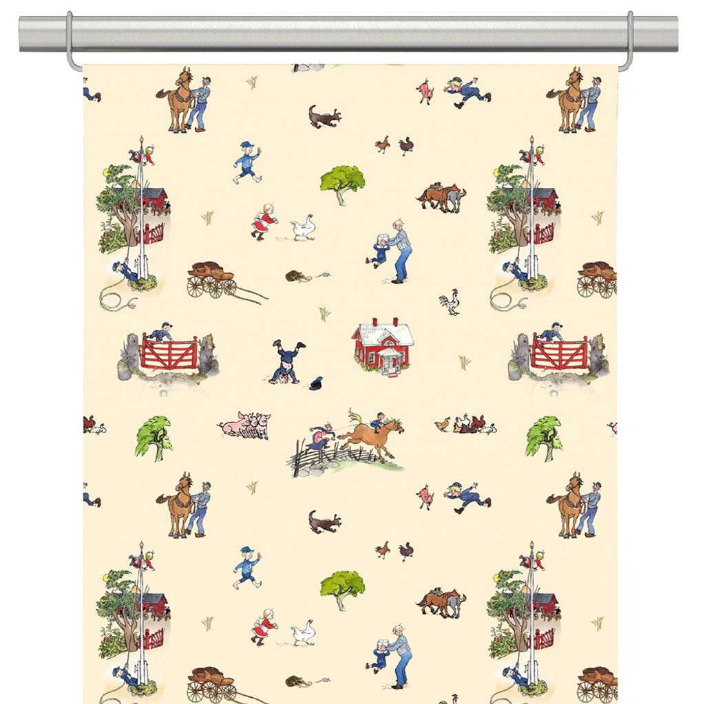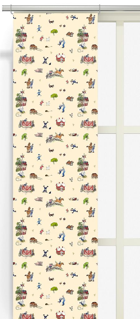 Den här panelgardinen från Arvidssons Textil visar scener ur Astrid Lindgrens älskade berättelser om Emil, Alfred, Lina och griseknoen. Med en offwhite botten och detaljrika illustrationer passar den både klassiska och lekfulla rum.