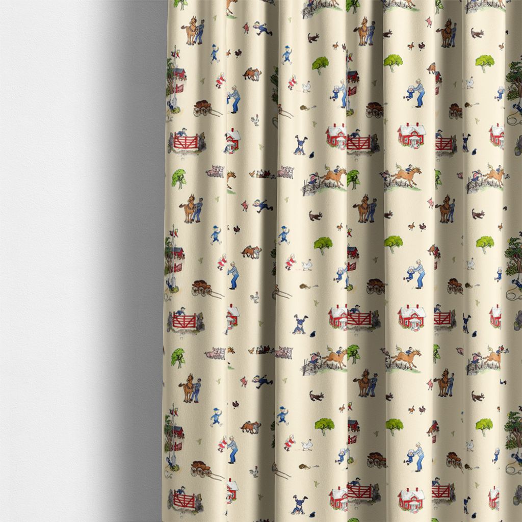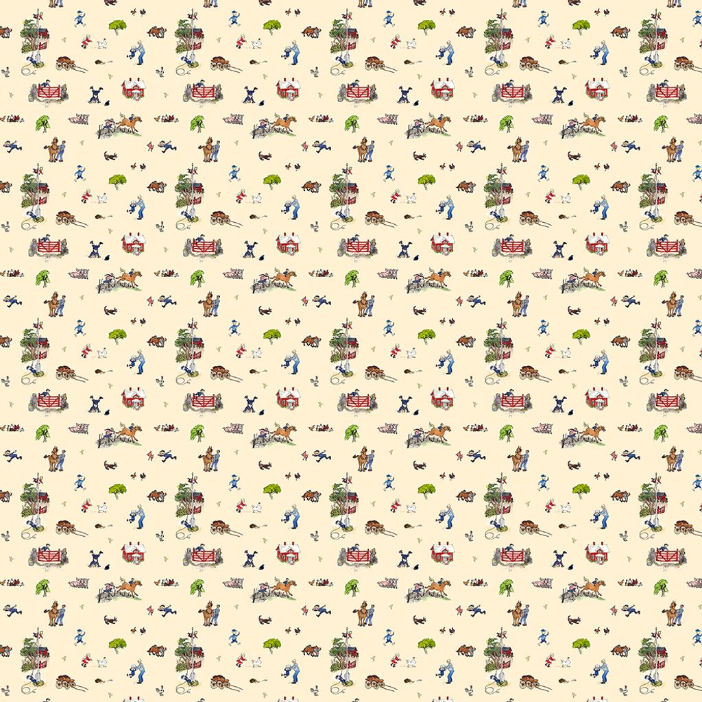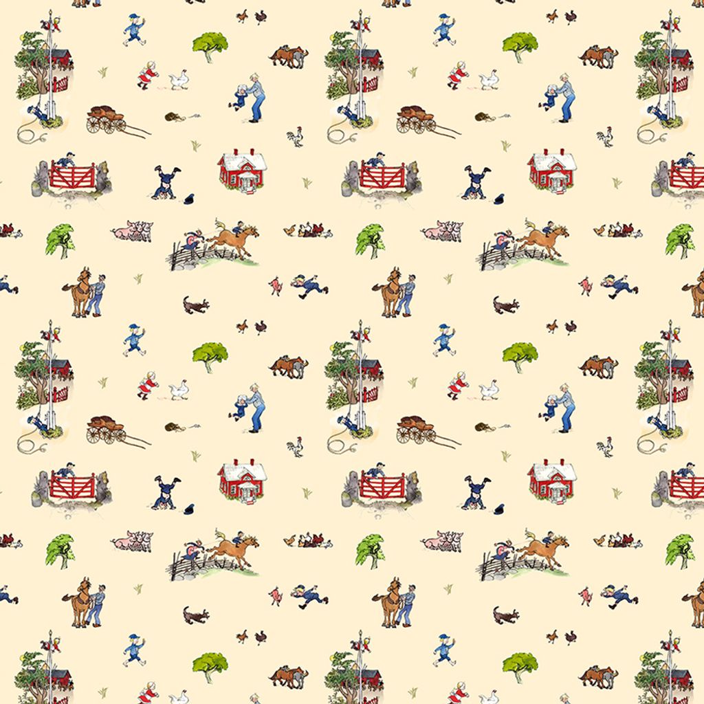 Ett levande bomullstyg med klassiska Emil i Lönneberga-motiv på beige botten. Perfekt för lekfulla textilprojekt och barnrum med lantlig charm.