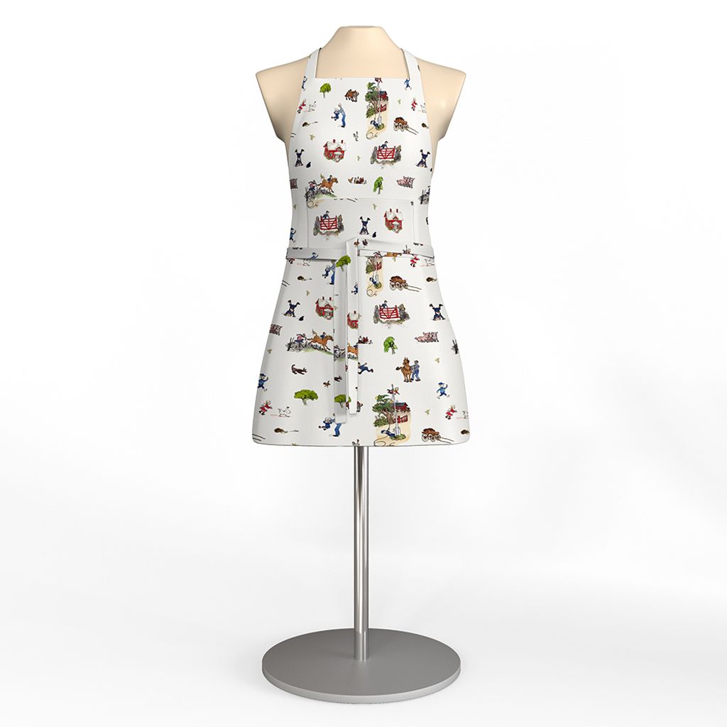Förkläde i bomull med Emil i Katthult – klassiskt motiv från Astrid Lindgrens värld, tryckt på offwhite bakgrund.