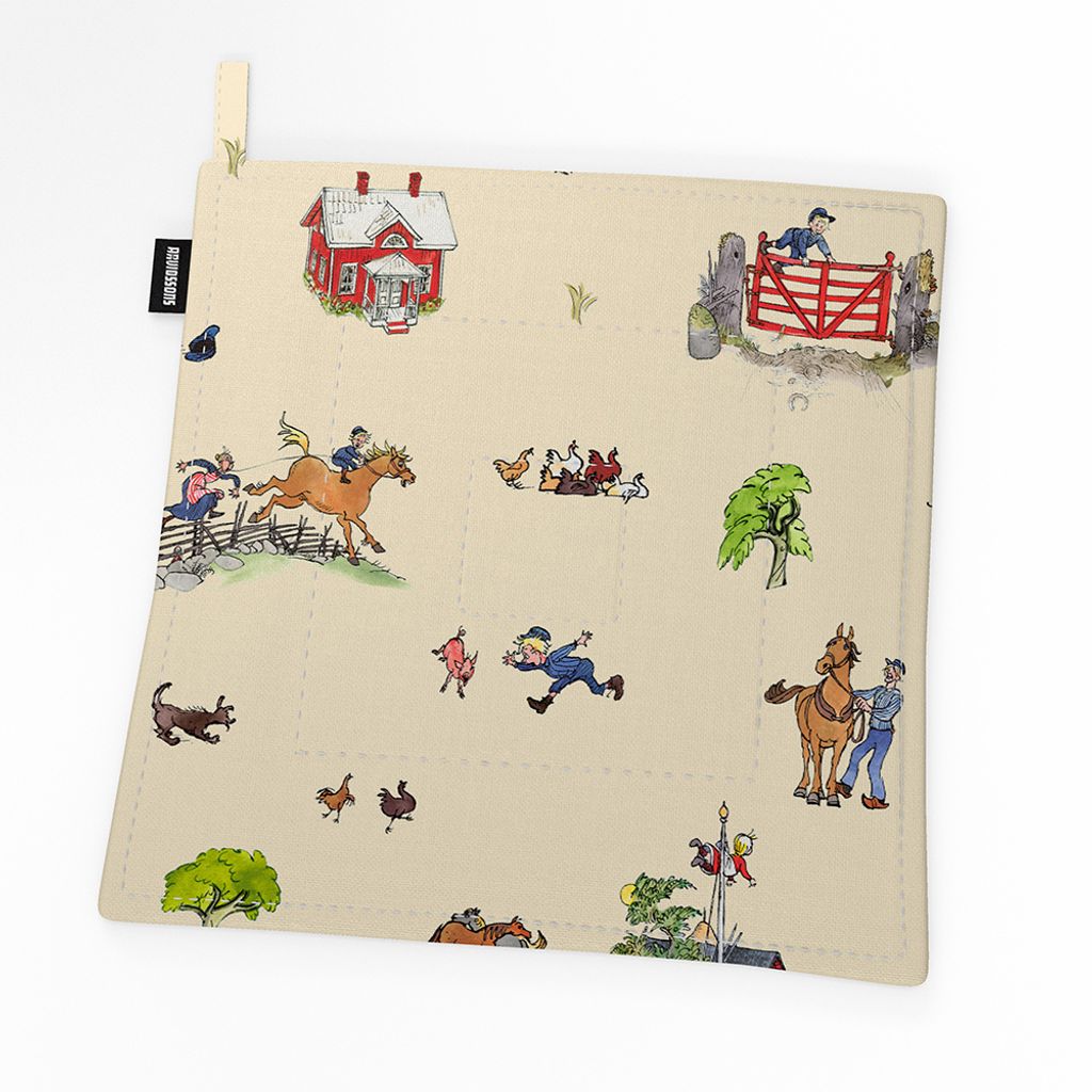 Den här charmiga grytlappen från Arvidssons Textil pryds av motiv från Emil i Lönneberga, med figurer som Emil, Ida, Alfred, Lina och förstås griseknoen. Tyget har en beige botten och färgstarka illustrationer som ger ett lekfullt och nostalgiskt intryck.