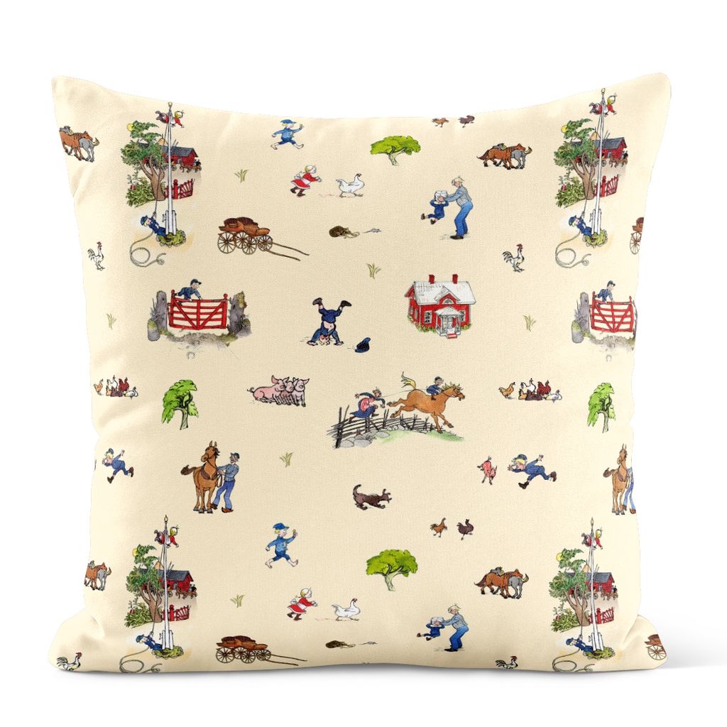 Det här kuddfodralet från Arvidssons Textil med motiv från Emil i Lönneberga, en av Astrid Lindgrens mest älskade figurer. Beige botten med Emil, Alfred, Lina och griseknoen – i ett klassiskt mönster som passar lika fint i barnrummet som i soffhörnan för vuxna som minns barndomen med kärlek.