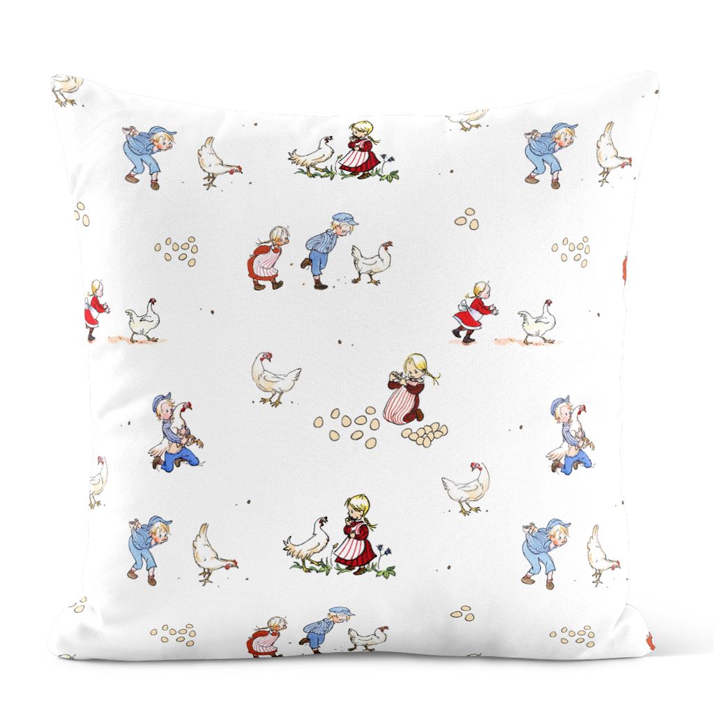 Emil & Ida i hönsgården kuddfodral är fyllt av liv och rörelse från den välkända gården i Katthult. Mot en ljus botten syns Emil och lillasyster Ida tillsammans i hönsgården, omgivna av pickande hönor, ägg och små vardagsögonblick som känns igen från Astrid Lindgrens berättelser.