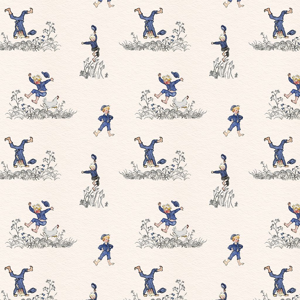 Emils Glädjeskutt beige är ett lekfullt bomullstyg hämtat ur Astrid Lindgrens berättelser om Emil i Lönneberga. Mönstret visar Emil mitt i sina välkända glädjeskutt, kullerbyttor och springande steg, ofta i sällskap av höns och natur från det småländska landskapet.