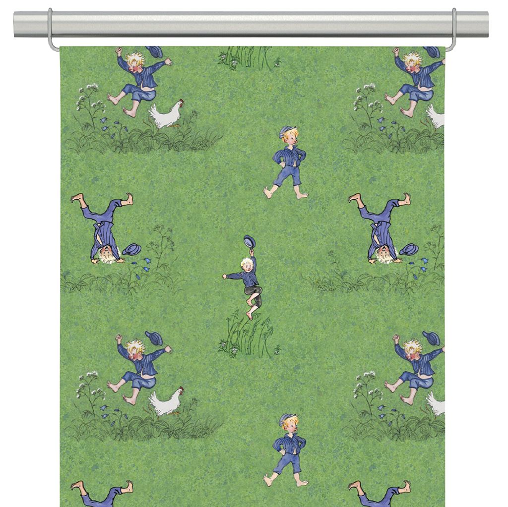 Emils Glädjeskutt grön panelgardiner fångar Emils sprudlande energi och frihetskänsla mitt i den småländska naturen. Mot en grön botten syns Emil springa, hoppa och slå kullerbyttor – ibland med mössan i luften och ibland med en höna i närheten. Mönstret ger ett levande men samtidigt harmoniskt uttryck, där rörelse och lek balanseras av den lugna gröna färgskalan.