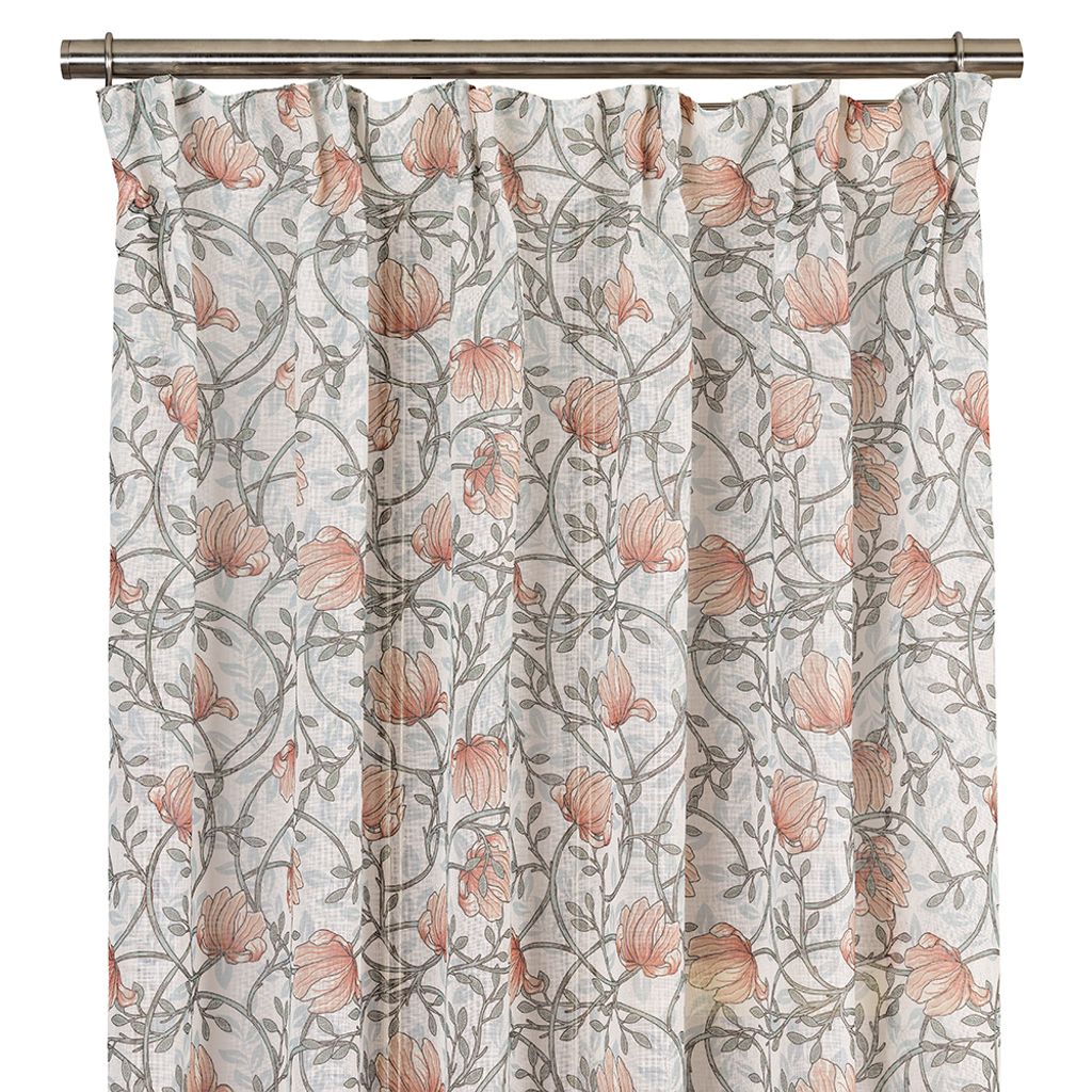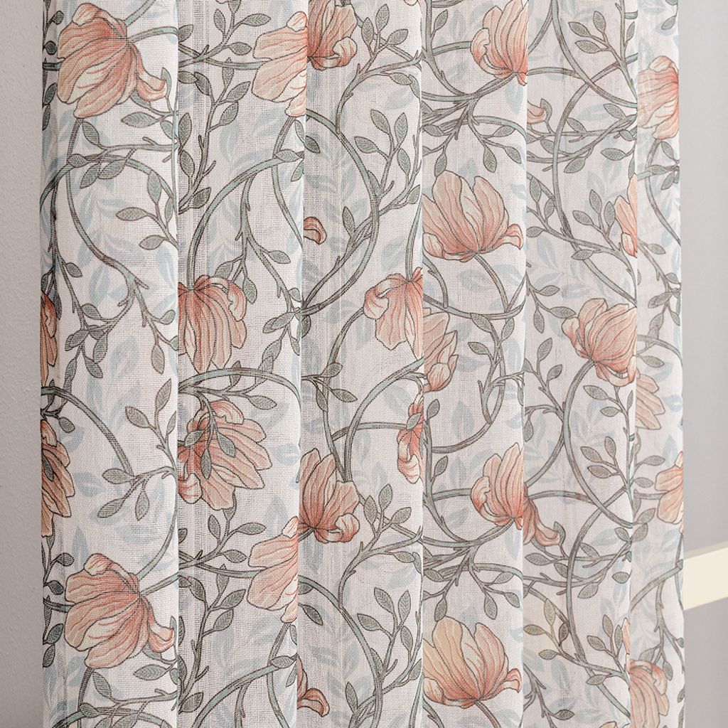 Emma grön är en skir och romantisk gardin med slingrande blommönster i grönt och aprikos. Den släpper in ljuset på ett mjukt sätt och skapar en ljus, somrig känsla i rummet.