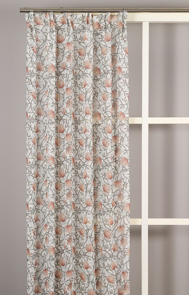 Designen är inspirerad av slingrande trädgårdsgrenar – ett klassiskt men luftigt mönster som passar utmärkt i allt från lantkök och sovrum till vardagsrum och sommarhus. Gardinen har ett fint fall och rör sig vackert i takt med ljuset och vinden.