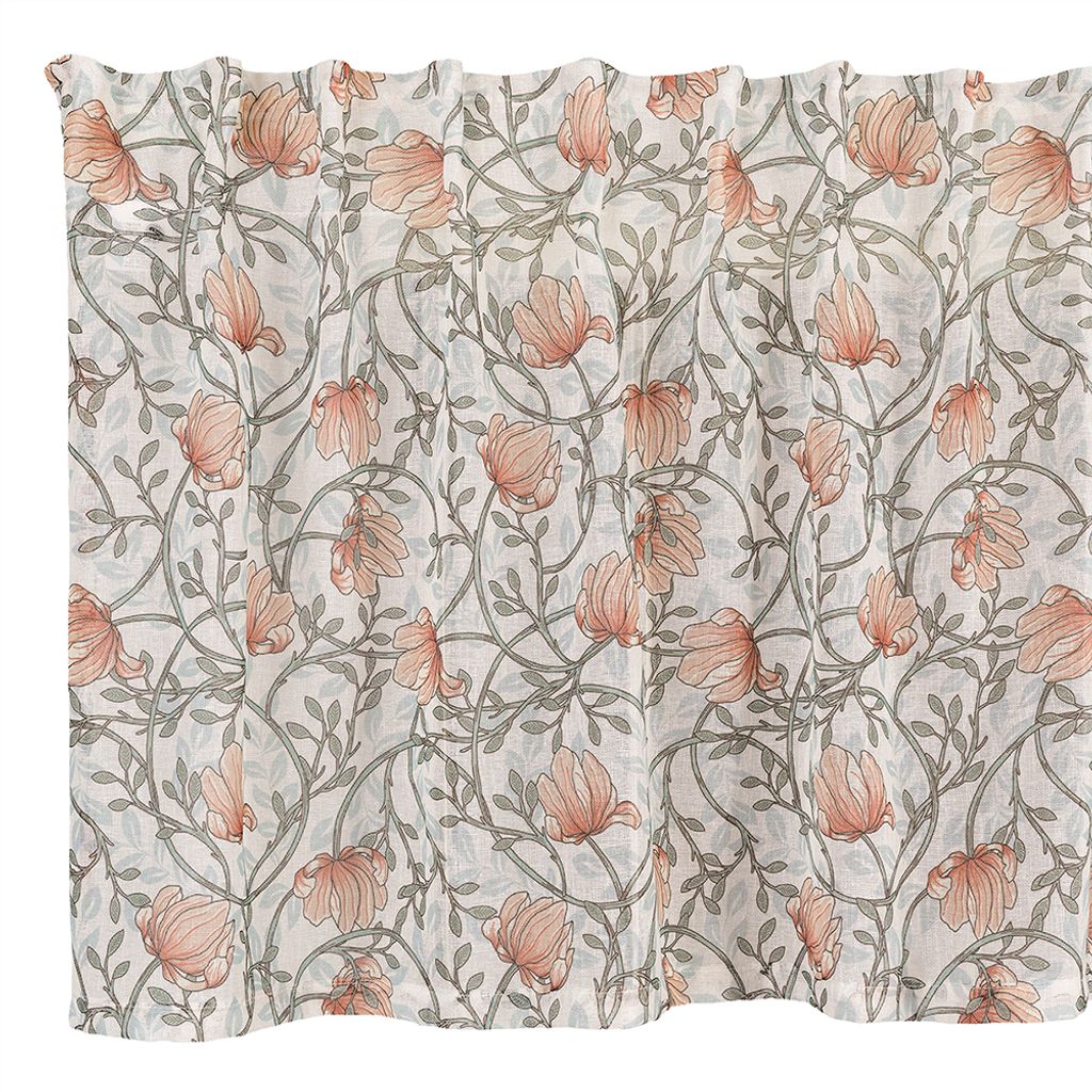 Blommönstret slingrar sig över ytan likt klätterväxter en varm sommardag, vilket gör att kappan känns levande och romantisk – perfekt för kök, lantliga hem, sommarhus eller sovrum där du vill ha en inramning som lyfter rummet utan att skymma ljusinsläppet. <