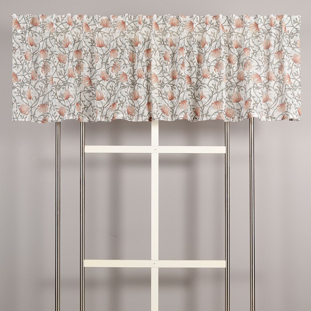 Den eleganta färgkombinationen av dämpade gröna blad och aprikosrosa blommor gör att gardinkappan smälter in i både klassiska och moderna interiörer.