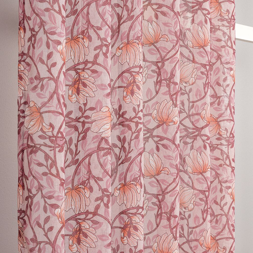 Emma rosa är en skir gardin med romantiskt blommönster i rosa och aprikos. Den släpper in ljuset på ett mjukt och vackert sätt – perfekt för att skapa en ljus, luftig och somrig atmosfär. Multibandslängder i 2-pack. Ouppfållad med overlock nedtill.