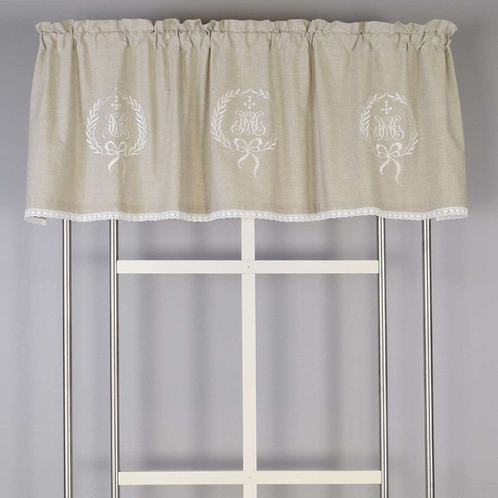 Beskrivning av Emmy linne gardinkappa med broderat monogram och spets