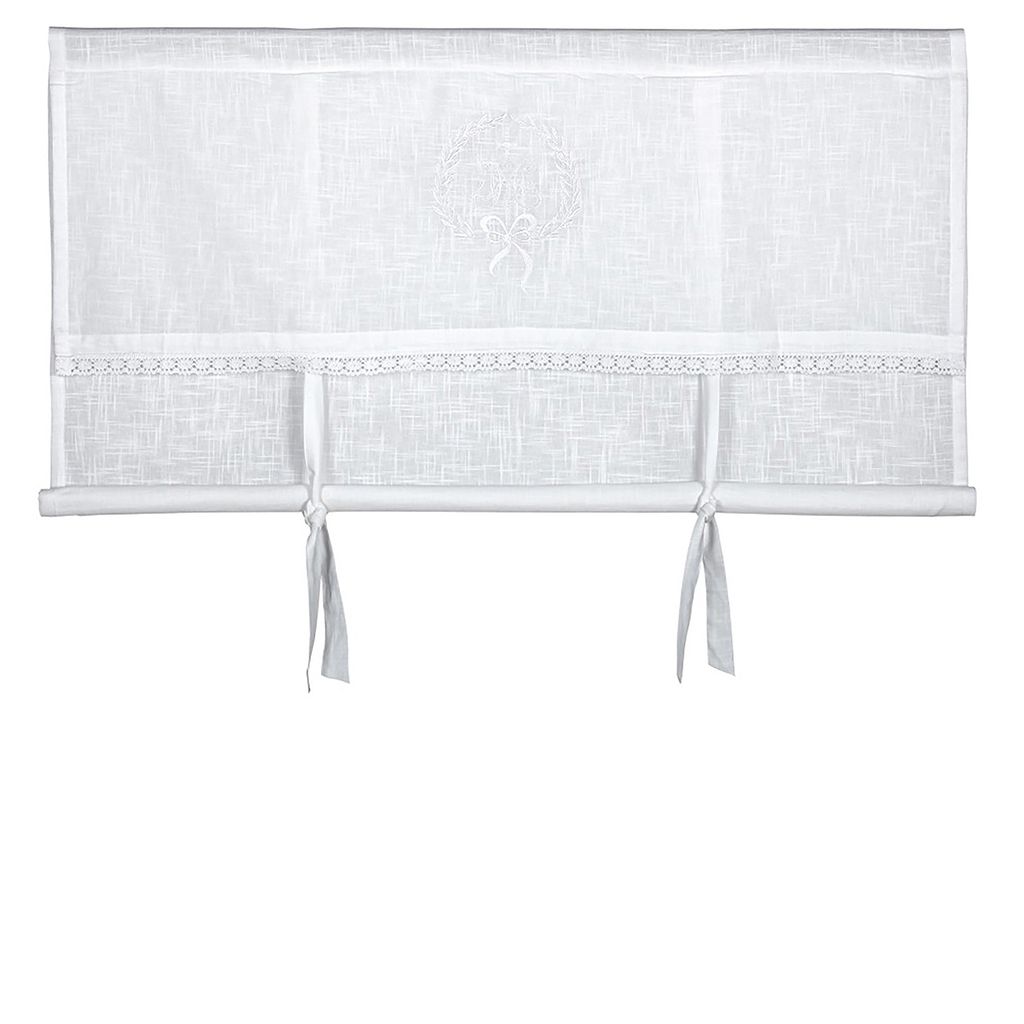 Beskrivning av Emmy vit hissgardin med broderat monogram och spets