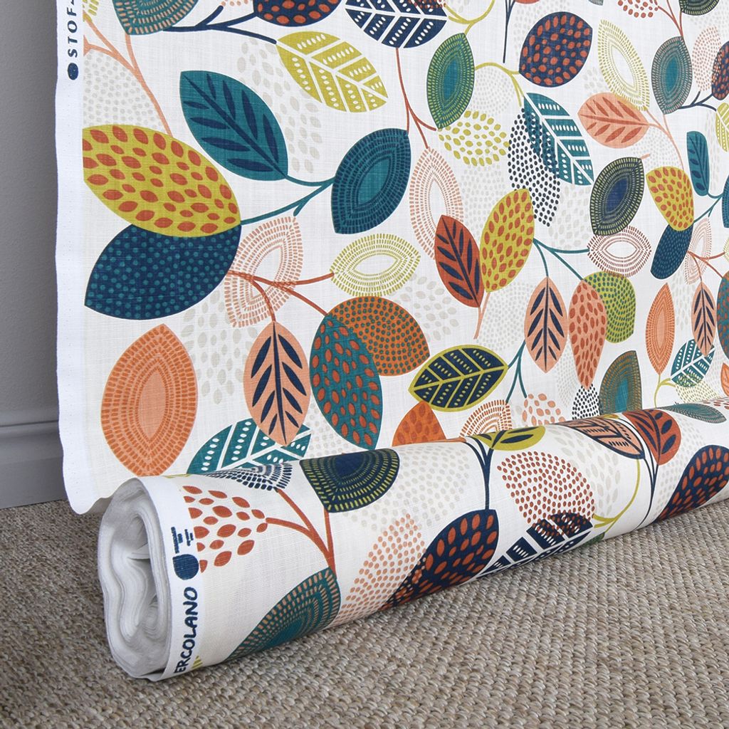 Ercolano är ett dekorativt bomullstyg med ett lekfullt och grafiskt bladmönster i en härlig mix av färger. Djupa nyanser av blått, grönt och terrakotta kombineras med ljusare toner av gult och beige, vilket ger en varm och naturlig känsla till hemmet. Mönstrets stiliserade löv och detaljerade texturer skapar ett modernt men samtidigt tidlöst uttryck.