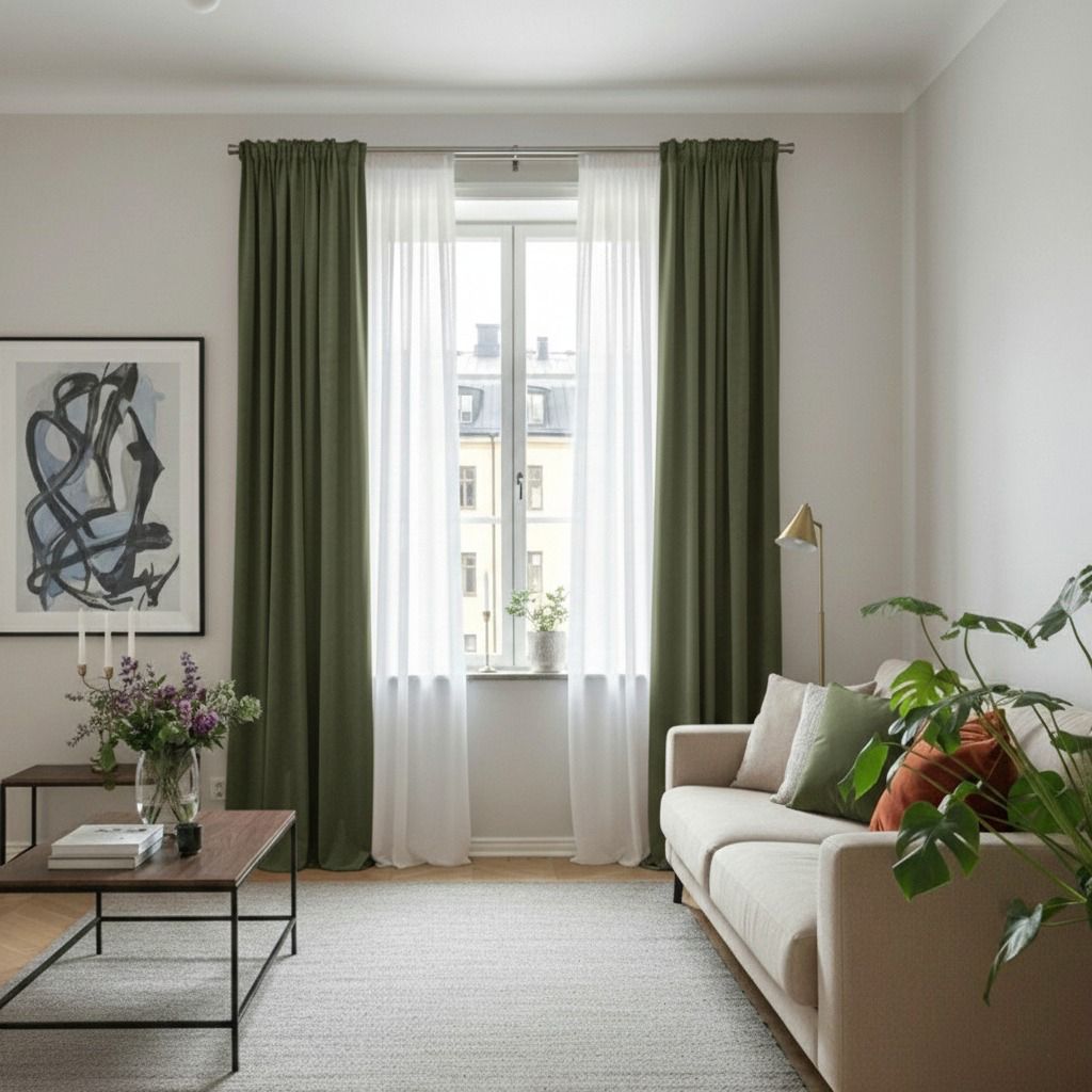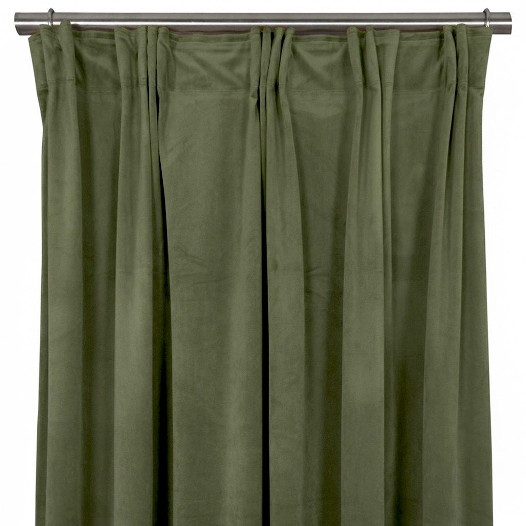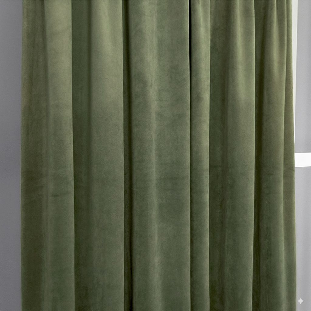 Ett par exklusiva gardiner i mossgrön lyxsammet.