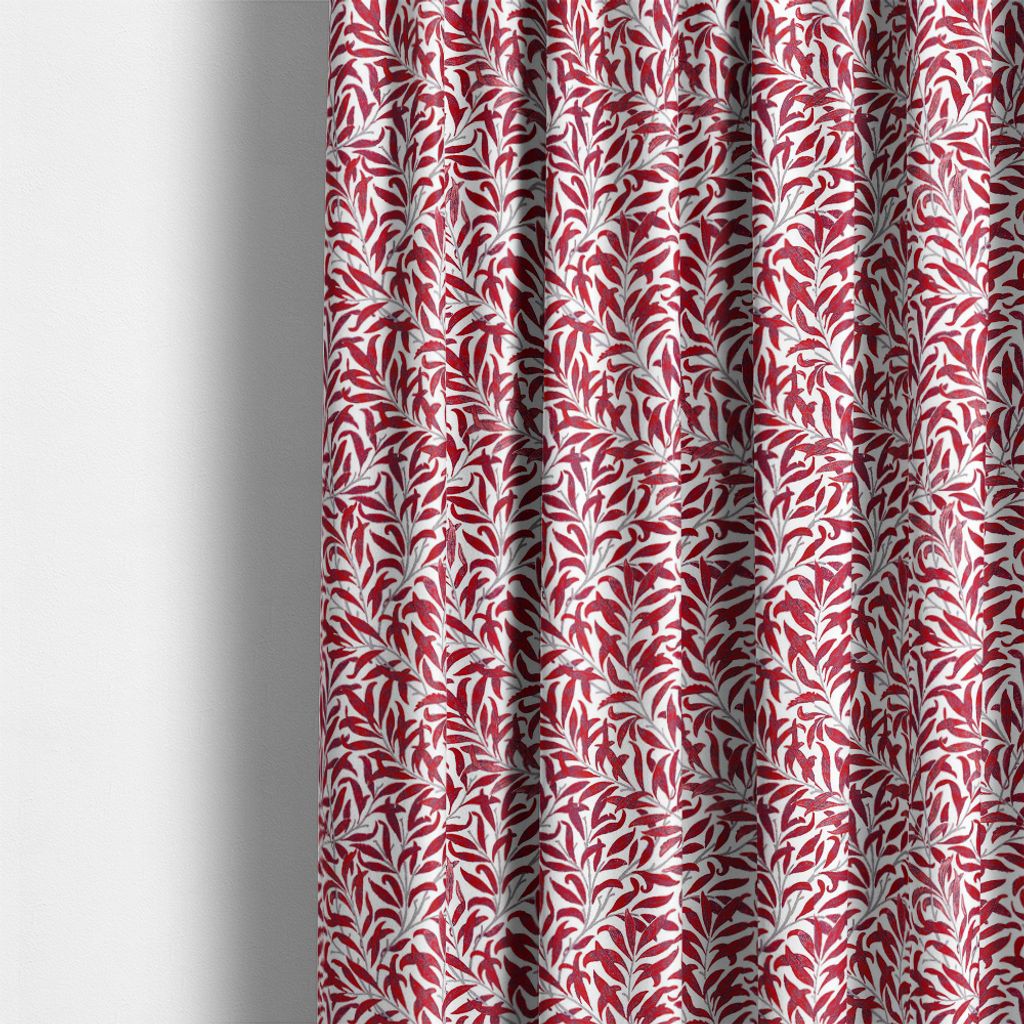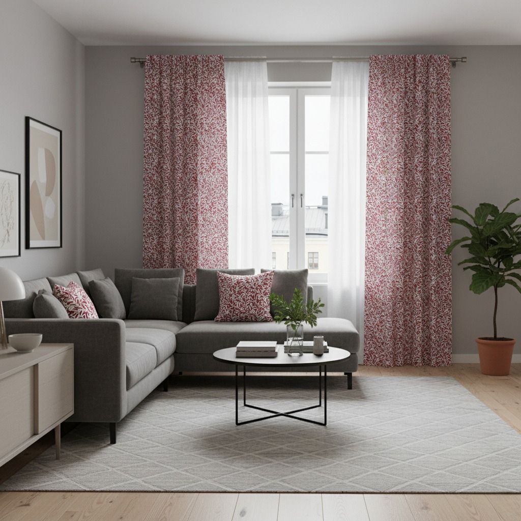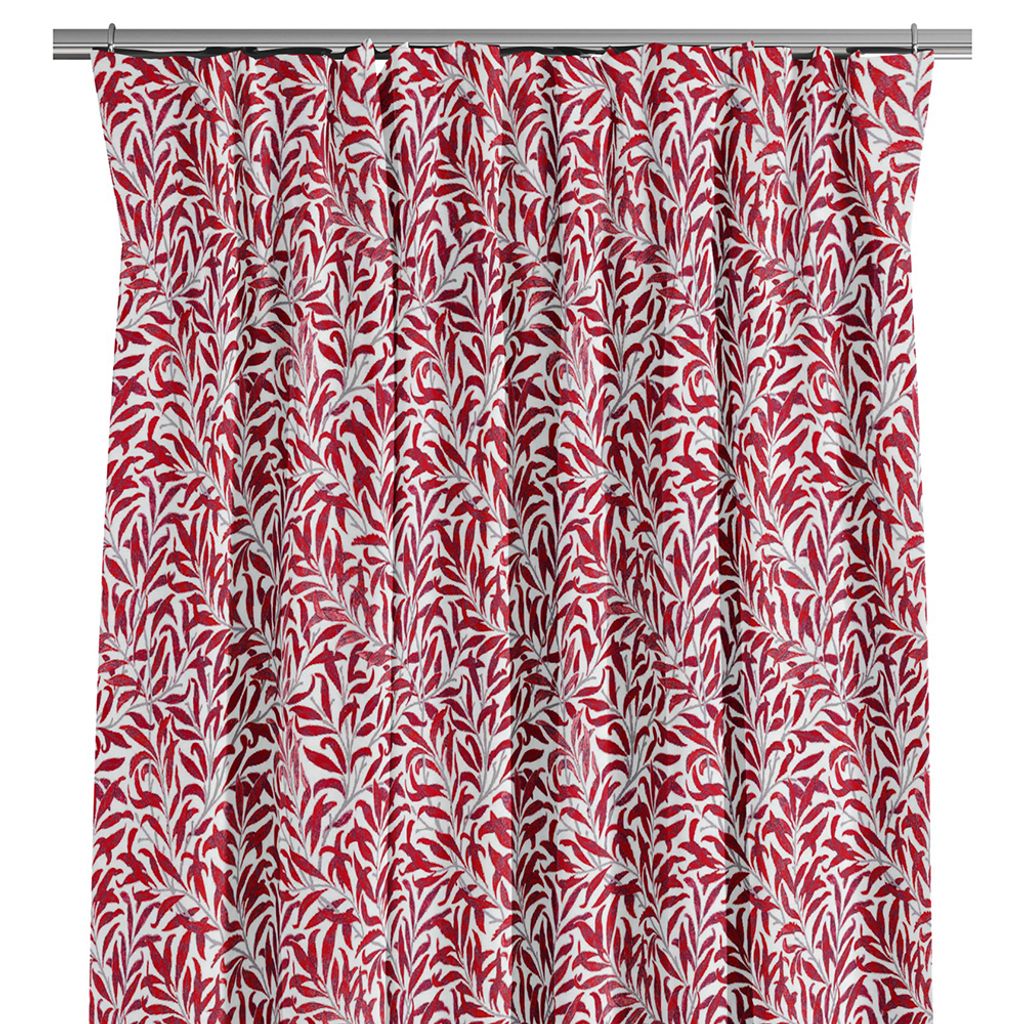 Beskrivning av Ester röd gardiner med tidlöst bladmönster