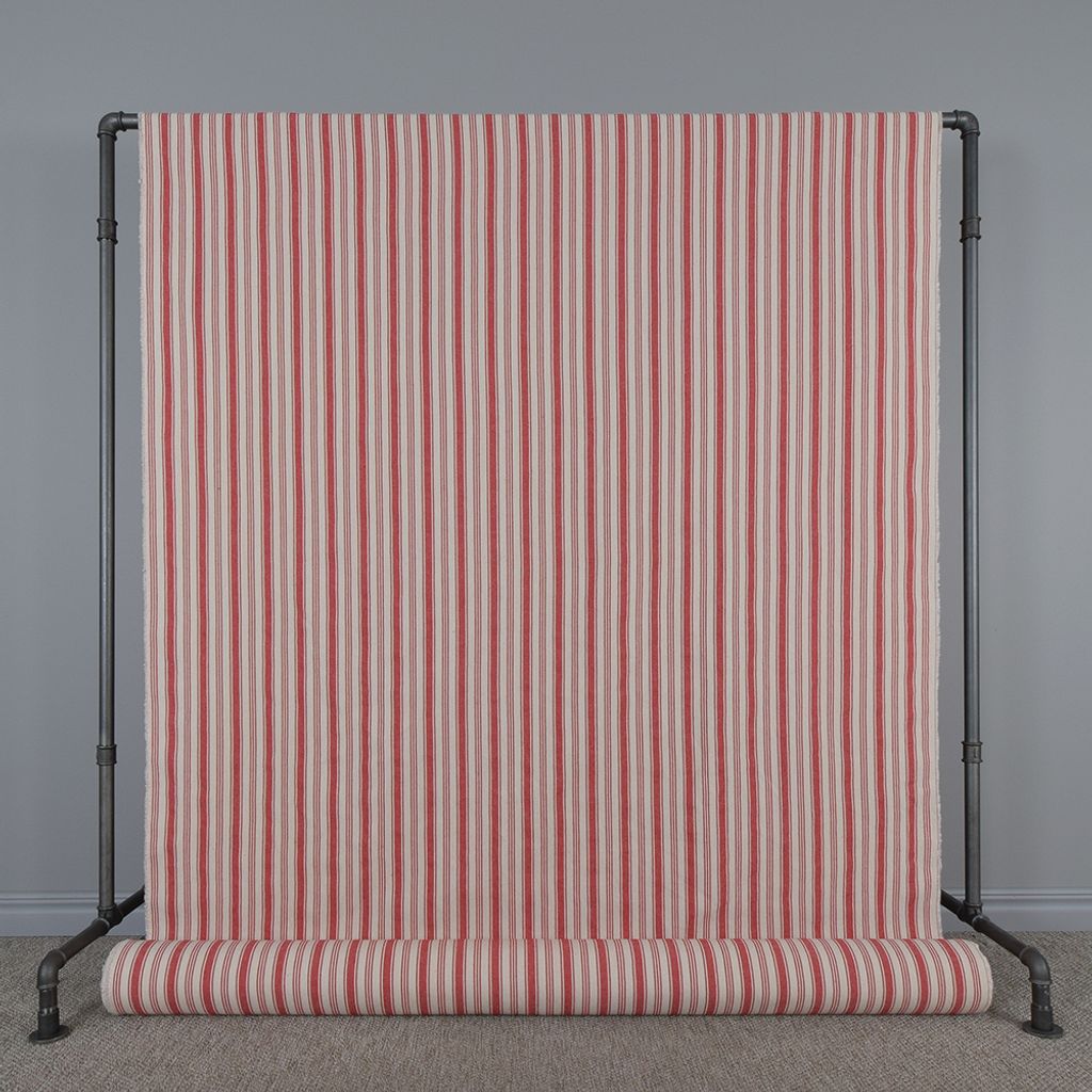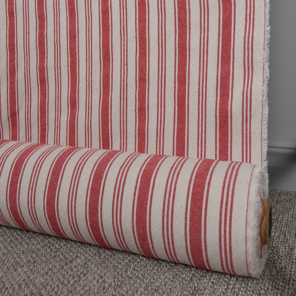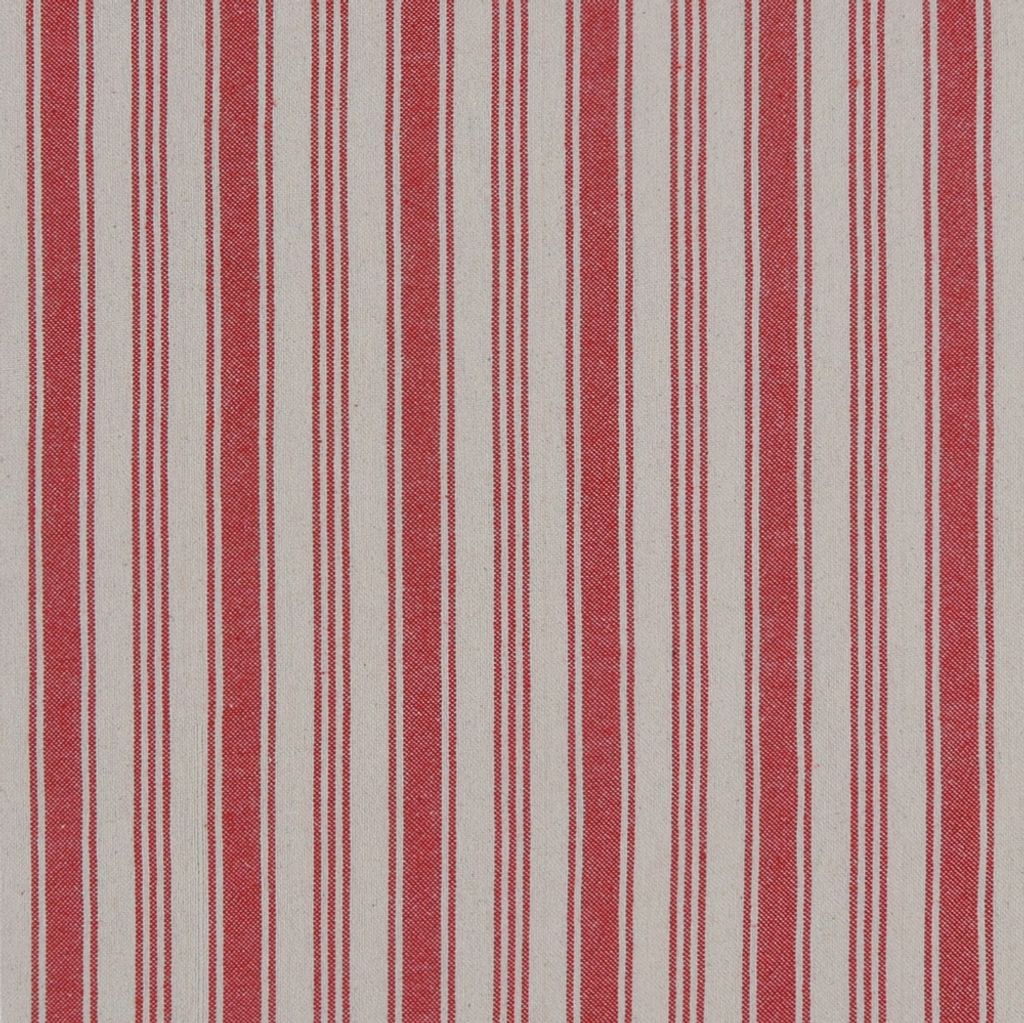 Randigt vävt tyg i beige och röd, perfekt för dukar och gardiner.
