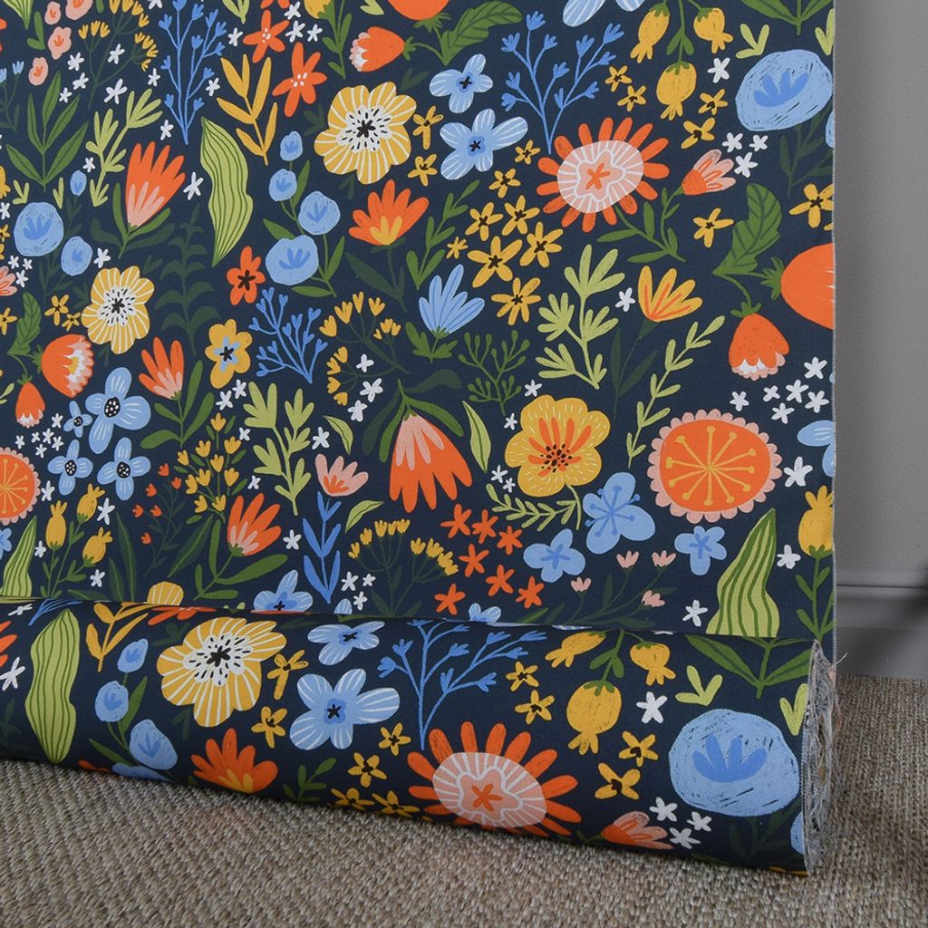 Evening Blossom är ett färgstarkt bomullstyg med ett vackert blommönster mot en mörk bakgrund. Med sina livliga nyanser av blått, orange, gult och grönt ger det en varm och inbjudande känsla till ditt hem. Perfekt för gardiner, kuddar, dukar och andra textila projekt.