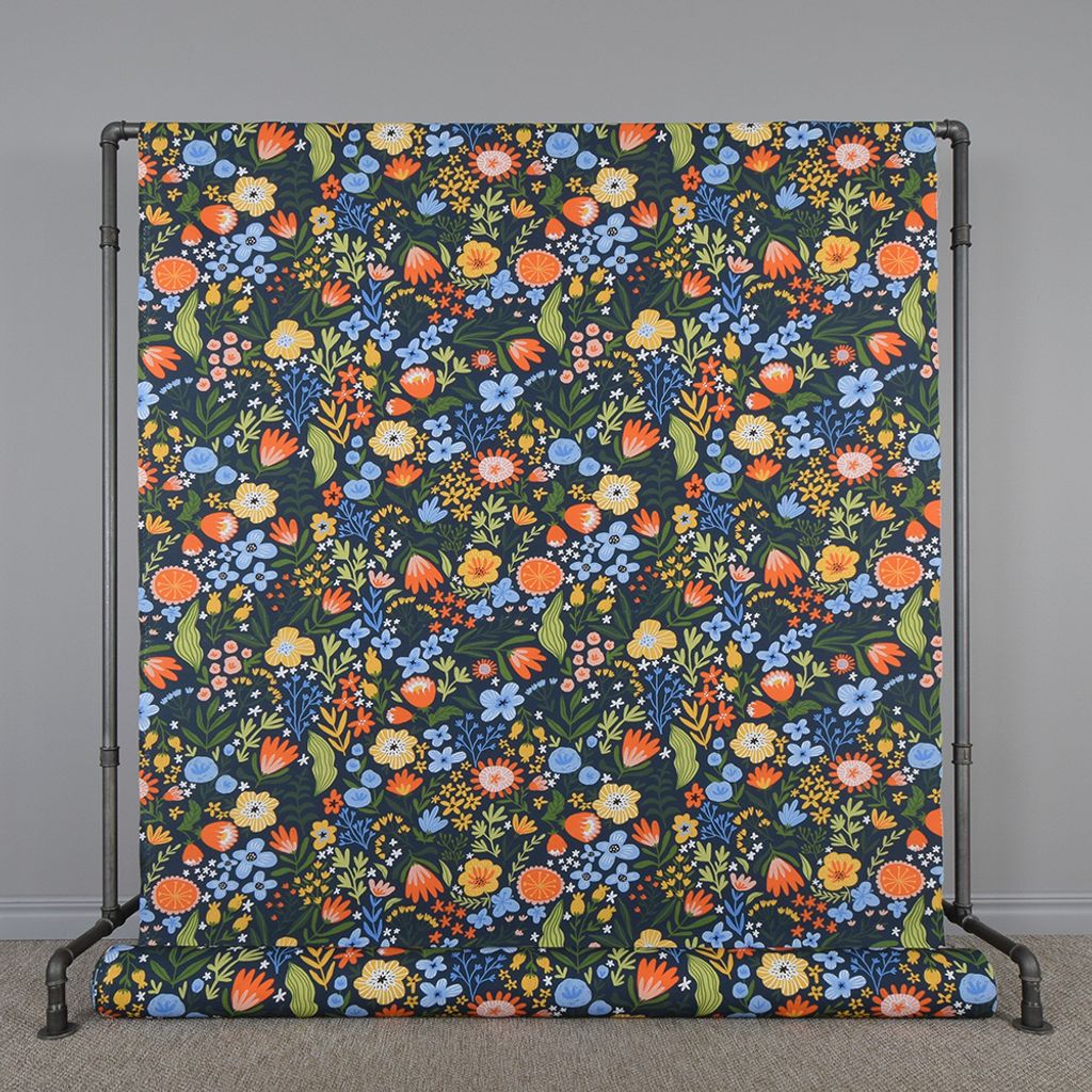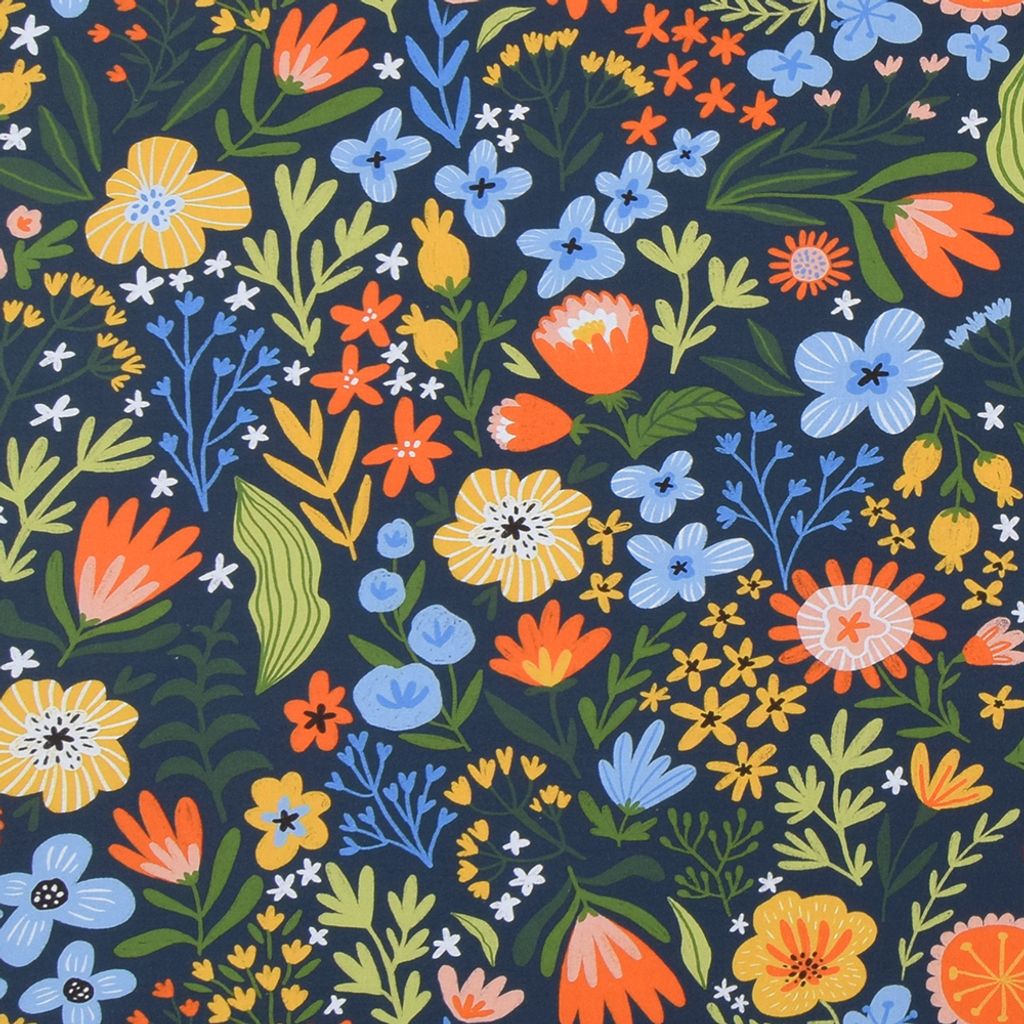 Evening Blossom är ett dekorativt bomullstyg som fångar skönheten av en blomstrande sommaräng i skymningen. Med en djup, mörk bakgrund och ett färgstarkt mönster av blommor i blått, orange, gult och grönt skapas en livlig men harmonisk kontrast. De vackra detaljerna och den lekfulla kompositionen gör att tyget känns både modernt och tidlöst.