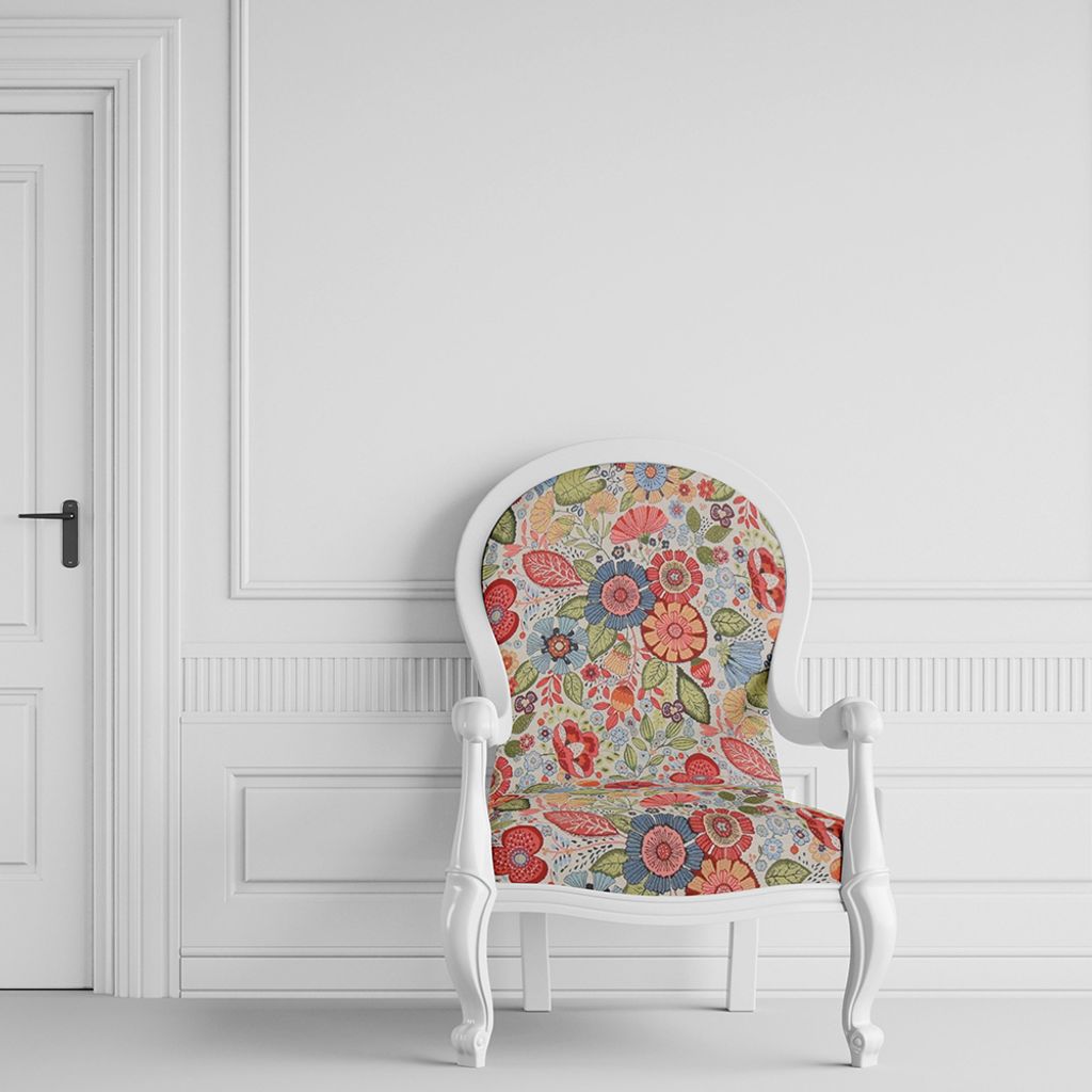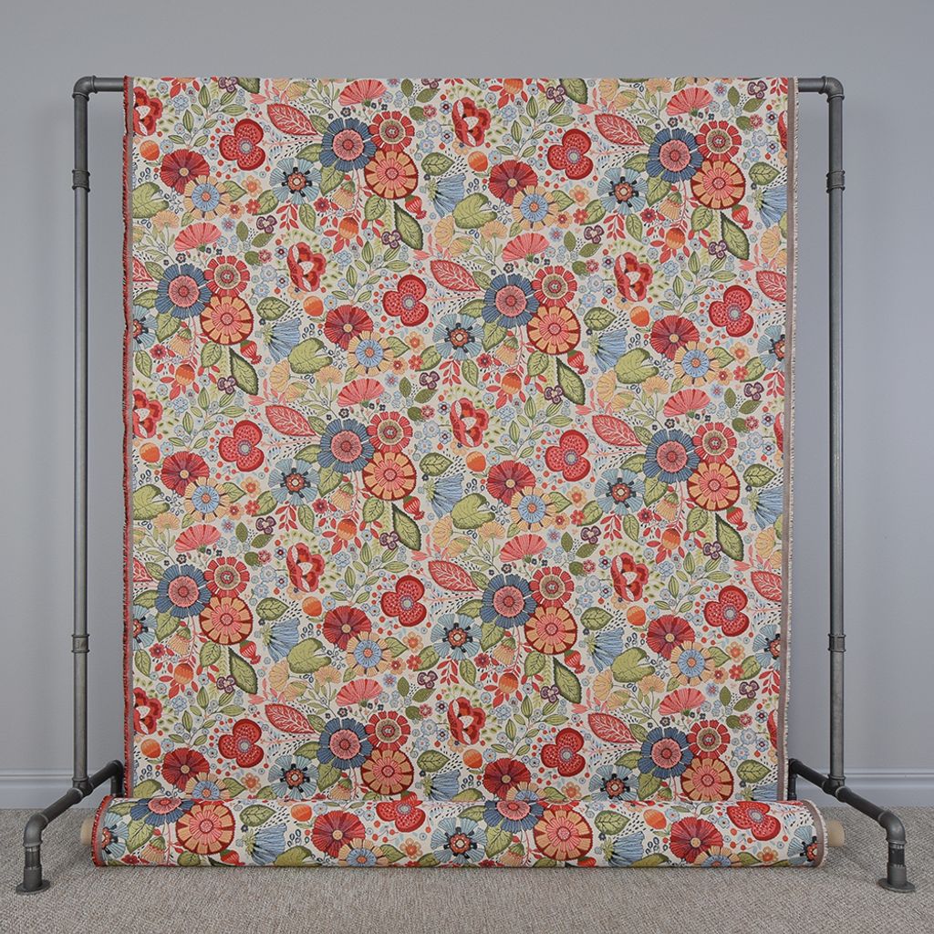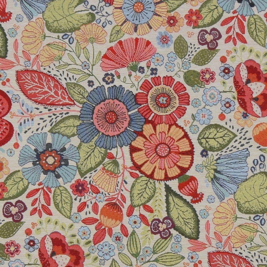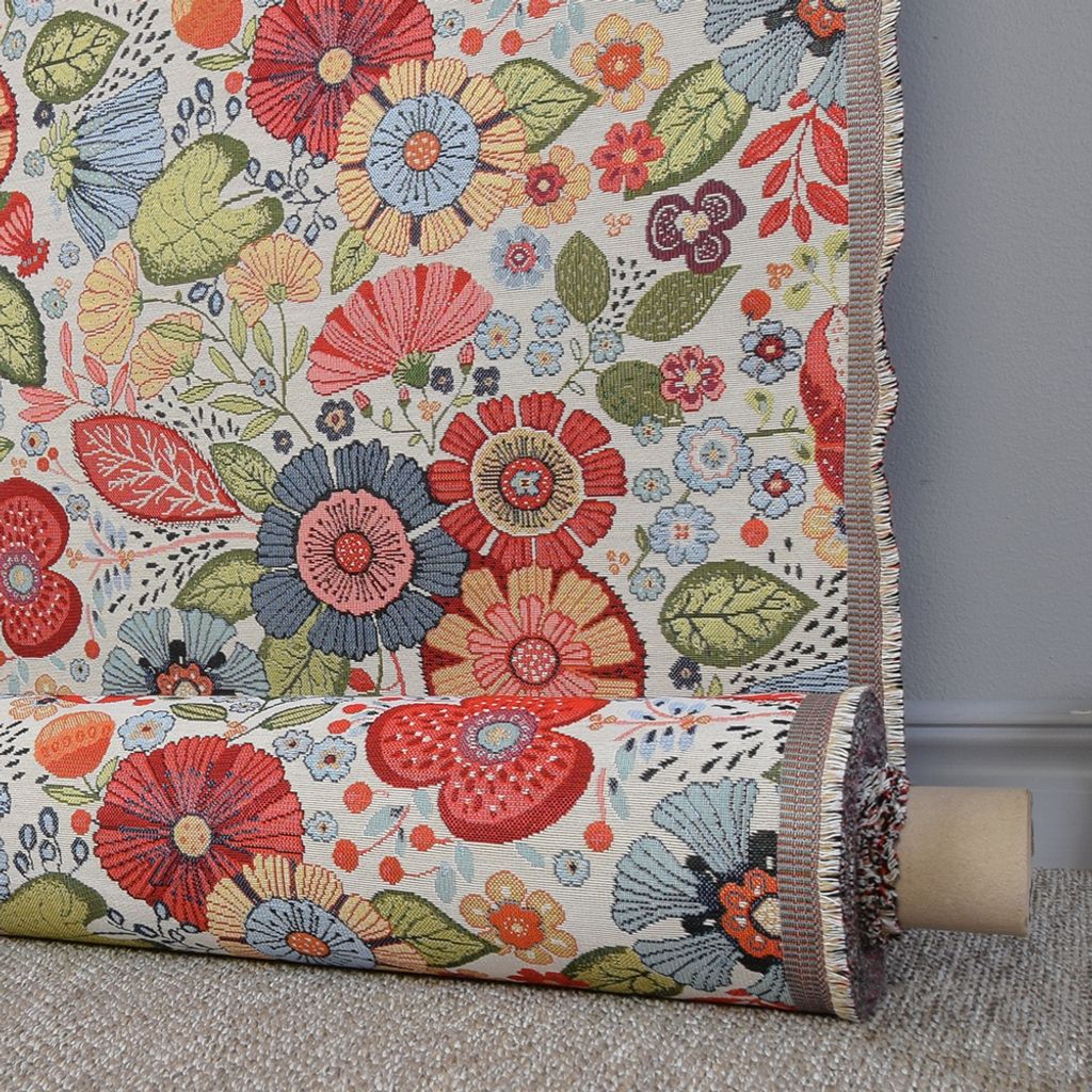 Kraftigt fint gobeläng/ jaquard tyg på metervara. Vackert blommigt mönster i rött, gult, orange, offwhite, grönt och blått.