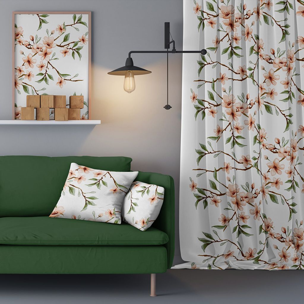 Gardiner med offwhite botten och mönster med snirklande kvistar, gröna blad och aprikosa blommor.