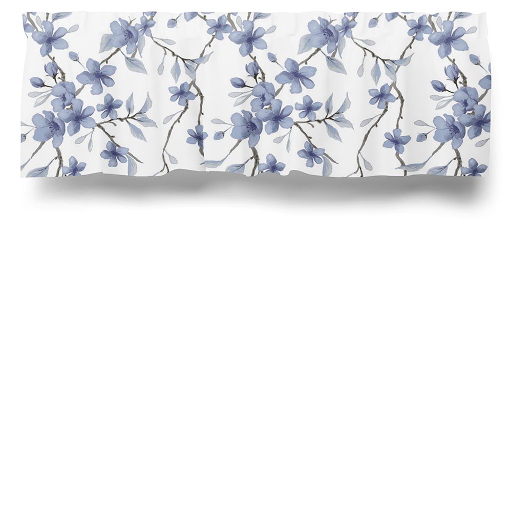 Gardinkappa på metervara med vit botten och blå-lila blommor.
