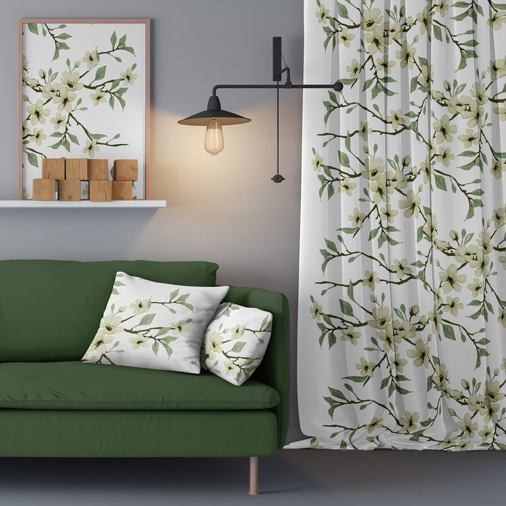 Fägring grön gardiner bjuder in naturens mjuka elegans till ditt hem. Mönstret föreställer tunna grenar som slingrar sig harmoniskt över tyget, fyllda med skira blommor i en mjuk gräddvit ton och frodiga gröna blad. Det akvarellinspirerade uttrycket ger gardinerna en lätt och luftig känsla, perfekt för att skapa en rogivande miljö i vardagsrum, sovrum eller matsal.