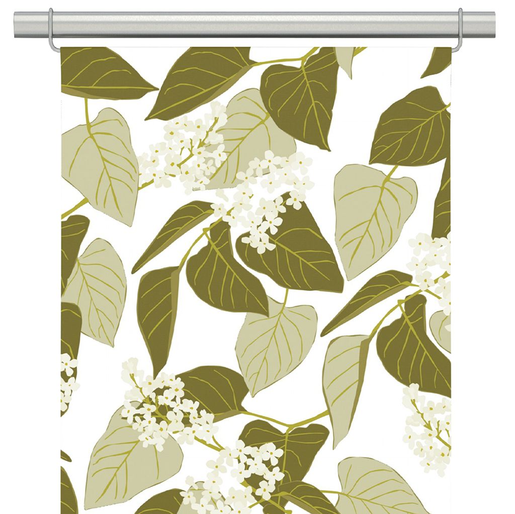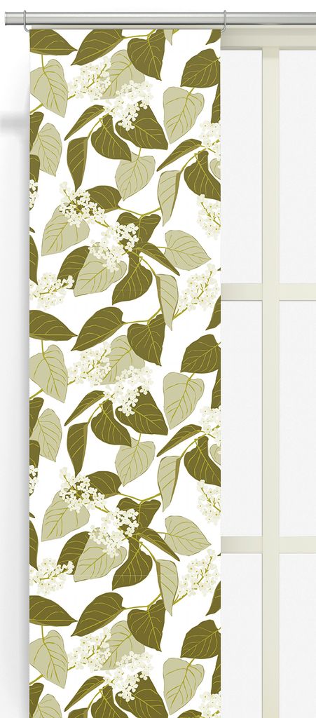 Vid Fikabordet panelgardiner i grönt är en naturnära gardin med blad och ljusa blomklasar som ger ett lugnt och harmoniskt uttryck.
