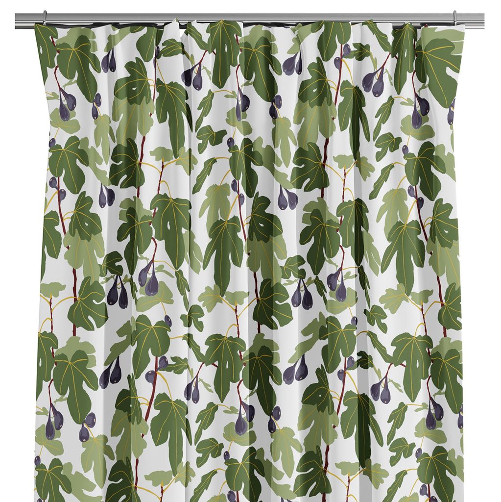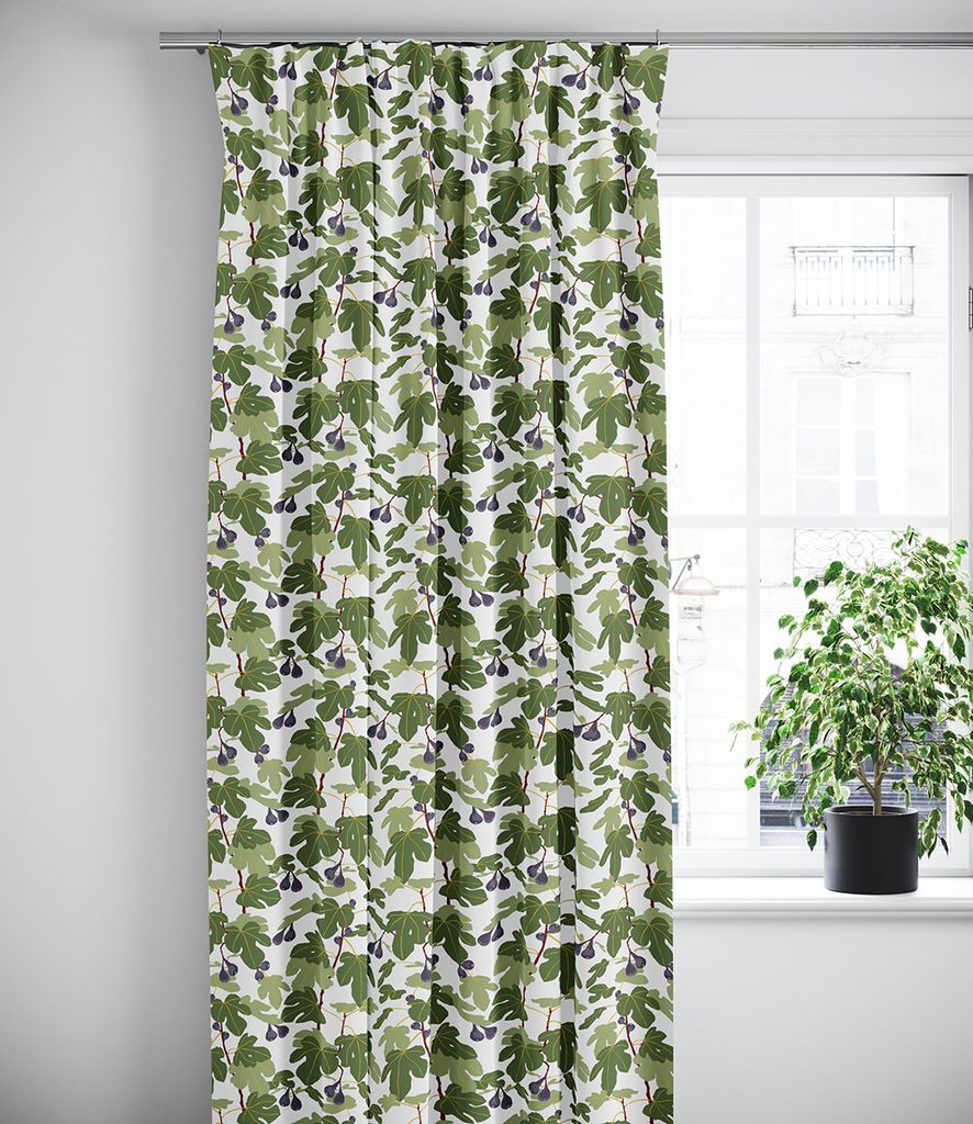 Fikonträd grön är gardiner med ett levande mönster av frodiga fikonblad och mörka fikon mot en ljus botten. Ett naturinspirerat uttryck som ger rummet lugn och karaktär.