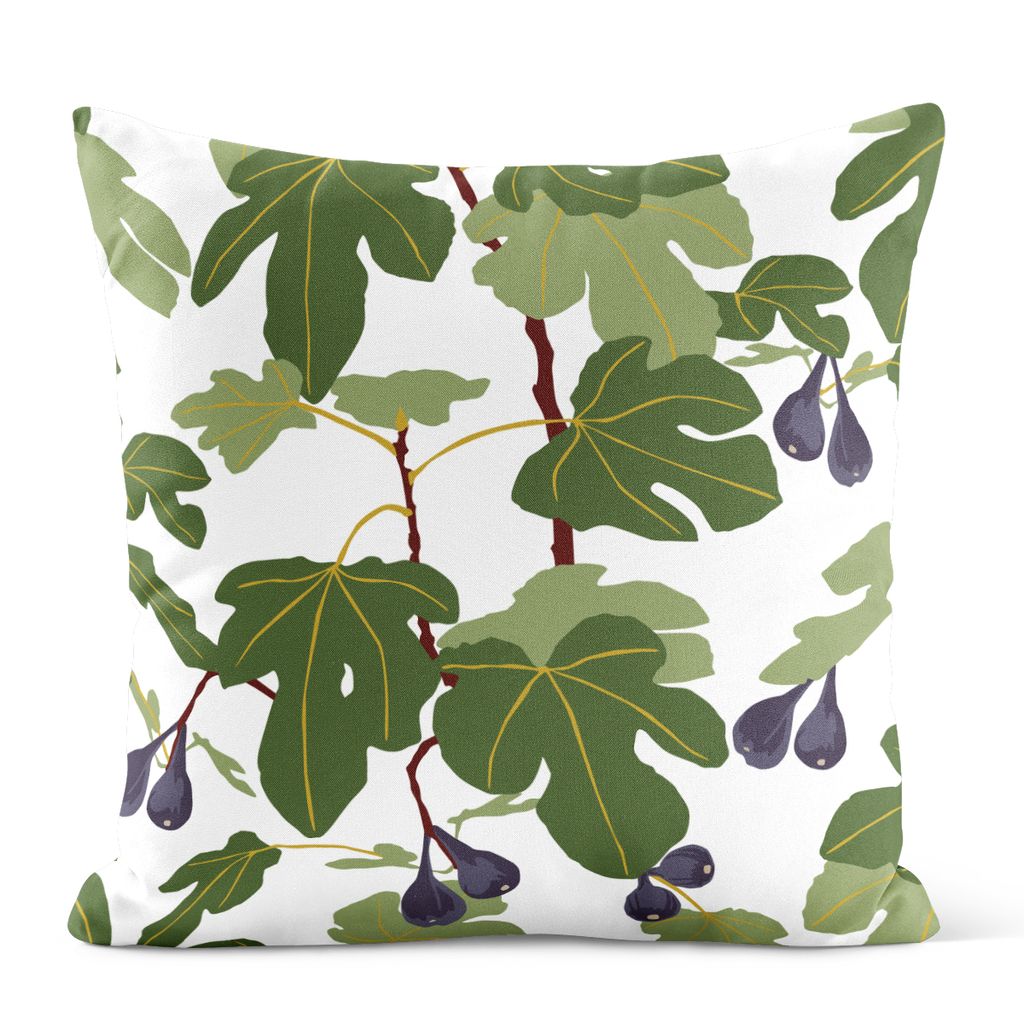 Ett dekorativt kuddfodral med motiv av fikonträd i gröna toner som ger en naturlig och levande känsla till rummet.
