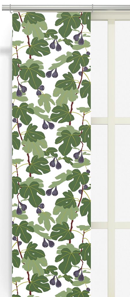 Fikonträd panelgardiner i grönt har ett naturinspirerat mönster med fikon och blad som ger ett fräscht och levande uttryck.