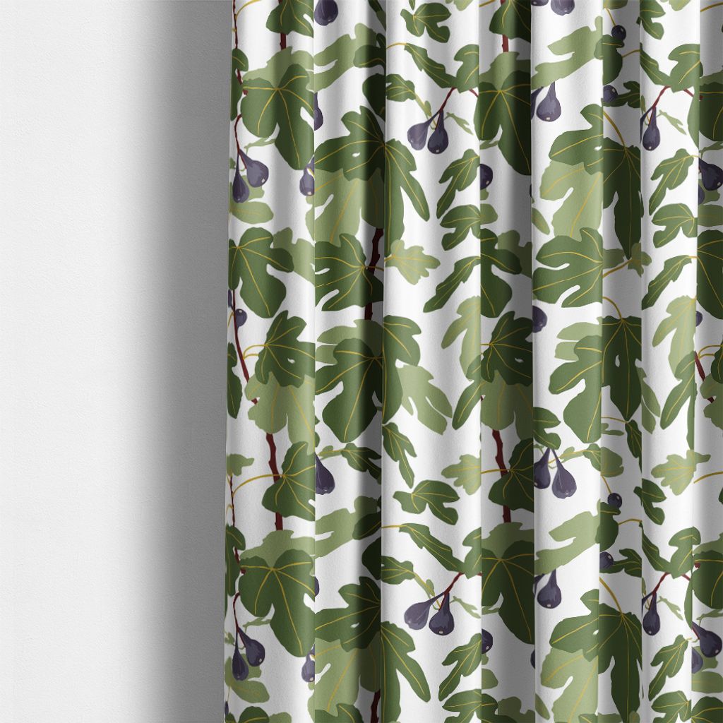 Fikonträd grön är ett dekorativt tyg med ett levande mönster av fikonlöv och frukter i olika gröna toner mot en ljus botten. Ett uttrycksfullt tyg som passar lika fint till gardiner som till kuddar och andra inredningsdetaljer.